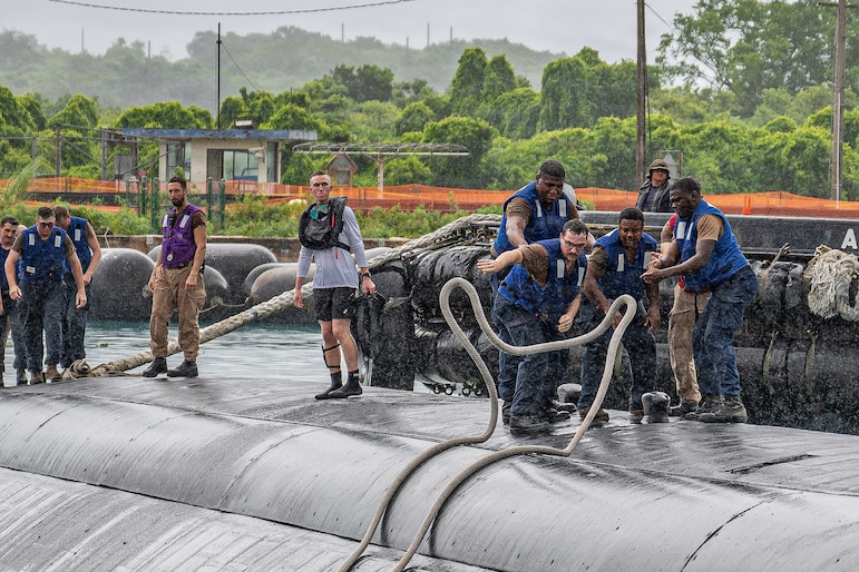 NAVAL BASE GUAM (Aug. 30, 2025) Sailors assigned to Los Angeles-class fast-attack submarine USS Annapolis (SSN 760) release mooring lines in preparation for the submarine’s departure from Naval Base Guam, Aug. 30, 2025. Assigned to Commander, Submarine Squadron 15, based at Polaris Point, Naval Base Guam, Annapolis is one of five forward-deployed fast-attack submarines. Renowned for their unparalleled speed, endurance, stealth, and mobility, fast-attack submarines are the backbone of the Navy’s submarine force. Regarded as apex predators of the sea, Guam’s fast-attack submarines serve at the tip of the spear, helping to reaffirm the submarine force's forward-deployed presence in support of a free and open Indo-Pacific. (U.S. Navy photo by Lt. James Caliva)