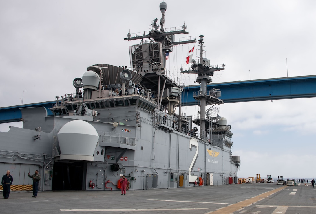Wasp-class amphibious assault ship USS Essex (LHD 2) sails under the Coronado Bridge as the ship transits the San Diego Bay, Oct. 6, 2025. (U.S. Navy photo by Mass Communication Specialist Seaman Apprentice Zachary Warr)