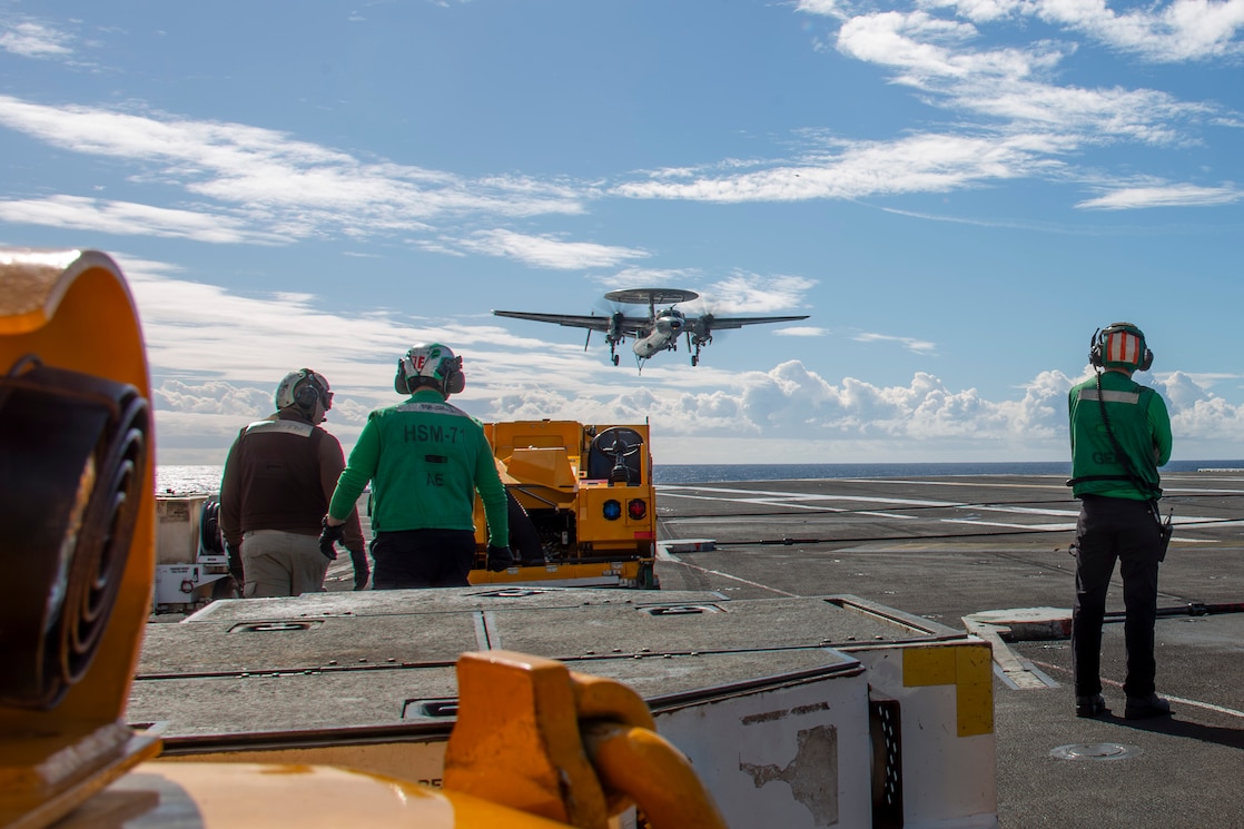 An E-2D Hawkeye, attached to Airborne Command & Control Squadron (VAW) 117, prepares to make an arrested landing on the flight deck of Nimitz-class aircraft carrier USS Abraham Lincoln (CVN 72), Nov. 22, 2025. Abraham Lincoln, flagship of the Abraham Lincoln Carrier Strike Group, is underway conducting routine operations in the U.S. 3rd Fleet area of operations, demonstrating the U.S. Navy’s long-term commitment to a free and open Indo-Pacific. (U.S. Navy photo by Mass Communication Specialist Seaman Daniel Kimmelman)