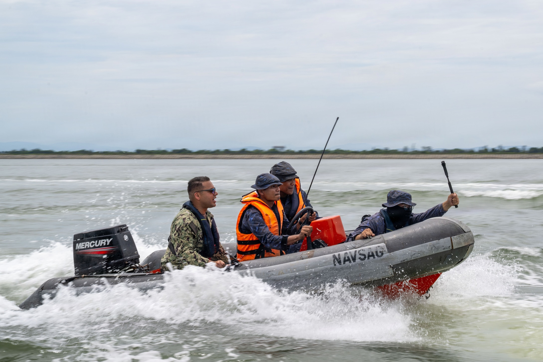 MUARA, Brunei (Oct. 27, 2025) U.S. Navy Chief Gunner’s Mate Caleb Rosario, Commander Task Force 75.4, Maritime Expeditionary Security Squadron (MSRON) 2, and members of the Royal Brunei Armed Forces act as an opposing force entering Royal Brunei Armed Forces controlled waters during exercise Cooperation Afloat Readiness and Training (CARAT) Brunei 2025, Oct. 27. This year marks the 31st iteration of CARAT, a multinational exercise series designed to enhance U.S. partner navies’ abilities to operate together in response to traditional and non-traditional maritime security challenges in the Indo-Pacific region. (U.S. Navy photo by Natasha Ninete)