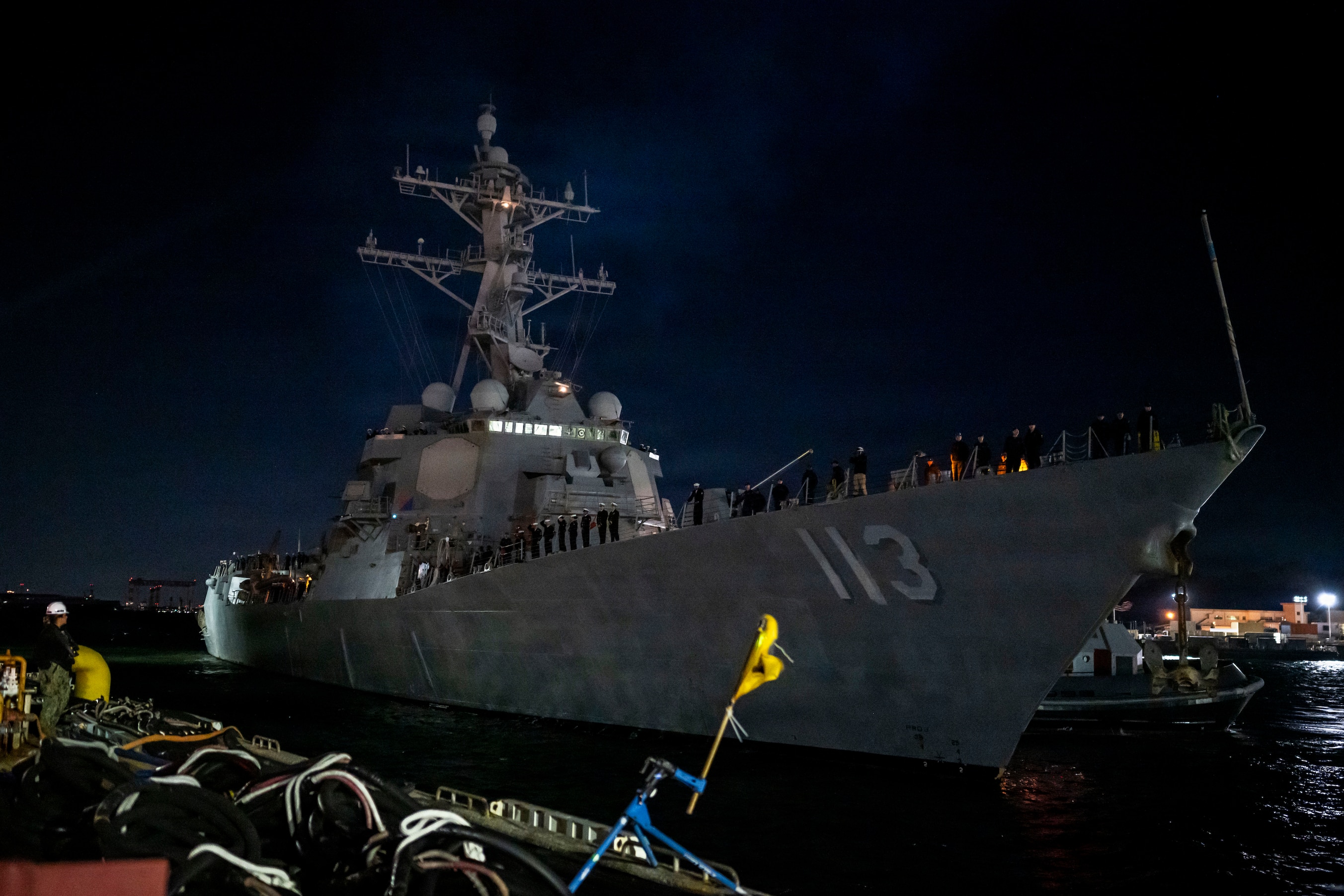 YOKOSUKA, Japan (Nov. 3, 2025) – Arleigh Burke-class guided-missile destroyer USS John Finn (DDG 113) returns to Commander Fleet Activities Yokosuka following a scheduled patrol in the Indo-Pacific, Nov. 3, 2025. John Finn is forward deployed and assigned to Destroyer Squadron (DESRON) 15, the Navy’s largest DESRON and U.S. 7th Fleet’s principal surface force. (U.S. Navy Photo by Chief Mass Communication Specialist Taylor DiMartino)