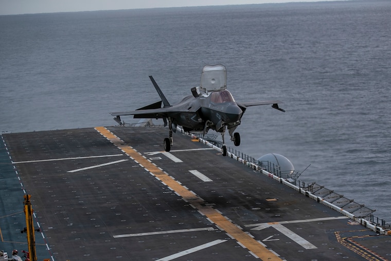An F-35B Lighting II, assigned to Marine Fighter Attack Squadron (VMFA) 242, lands on the flight deck during flight operations aboard forward-deployed amphibious assault carrier USS Tripoli (LHA 7), Nov. 28, 2025. Tripoli is currently underway conducting routine operations in the U.S. 7th Fleet area of operations. U.S. 7th Fleet is the U.S. Navy’s largest forward-deployed numbered fleet and routinely interacts and operates with allies and partners in preserving a free and open Indo-Pacific region. (U.S. Navy photo by Mass Communication Specialist Seaman Apprentice Reese Mitchell Taylor)