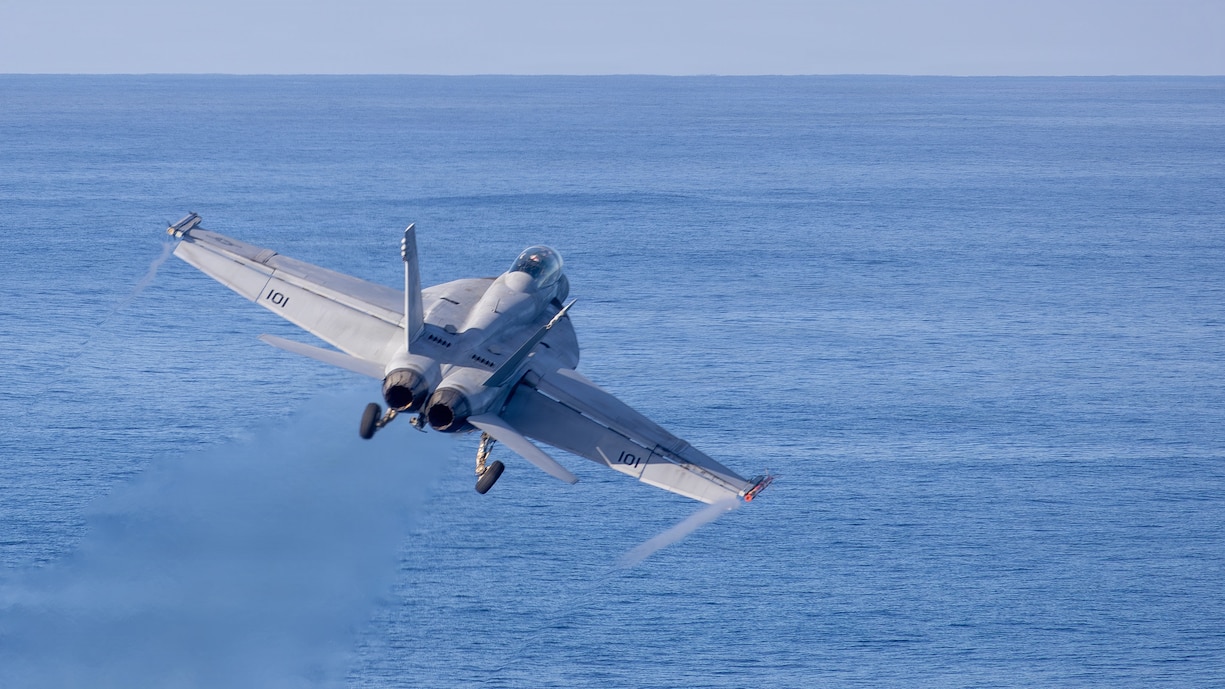 PACIFIC OCEAN (Nov. 3, 2025) – An F/A-18F Super Hornet, assigned to Strike Fighter Squadron (VFA) 154, takes off from the flight deck of Nimitz-class aircraft carrier USS Theodore Roosevelt (CVN 71), Nov. 3. Theodore Roosevelt, flagship of Carrier Strike Group (CSG) 9, is underway in the U.S. 3rd Fleet area of operations conducting advanced training to bolster strike group readiness and capability. (U.S. Navy photo by Mass Communication Specialist Seaman Apprentice Tyler Harstad)