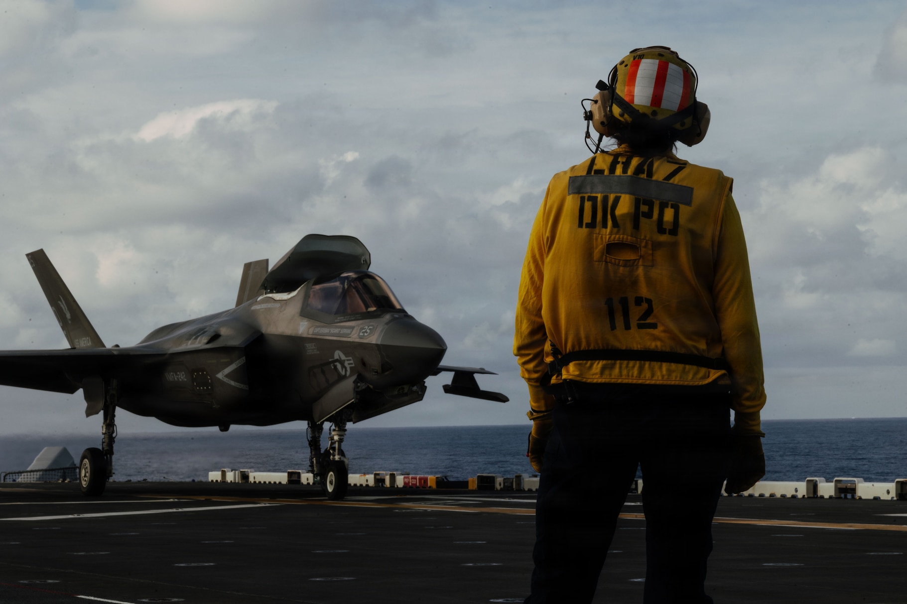 A U.S. Marine Corps F-35B Lightning II, assigned to Marine Fighter Attack Squadron (VMFA) 242, prepares to take off during flight operations aboard forward-deployed amphibious assault carrier USS Tripoli (LHA 7), flagship of the Tripoli Expeditionary Strike Group, Dec. 2, 2025, while conducting routine operations in the U.S. 7th Fleet area of operations. Marines and Sailors conducted flight operations in order to expand mission capabilities in support of the 31st MEU. U.S. The 31st MEU, the Marine Corps’ only continuously forward-deployed MEU, provides a flexible and lethal force ready to perform a wide range of military operations as the premiere crisis response force in the Indo-Pacific region. (U.S. Marine Corps photo by Lance Cpl. Raul Sotovilla)