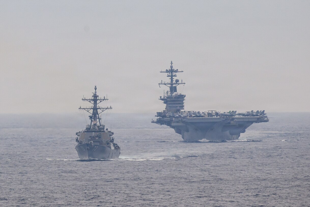 PACIFIC OCEAN (Nov. 14, 2025) – Arleigh Burke-class guided-missile destroyer USS Decatur (DDG 73), left, transits the Pacific Ocean in formation with Nimitz-class aircraft carrier USS Theodore Roosevelt (CVN 71), Nov. 14. Theodore Roosevelt, flagship of Carrier Strike Group (CSG) 9, is underway in the U.S. 3rd Fleet area of operations conducting advanced training to bolster strike group readiness and capability. (U.S. Navy photo by Mass Communication Specialist 3rd Class Aaron Haro Gonzalez)