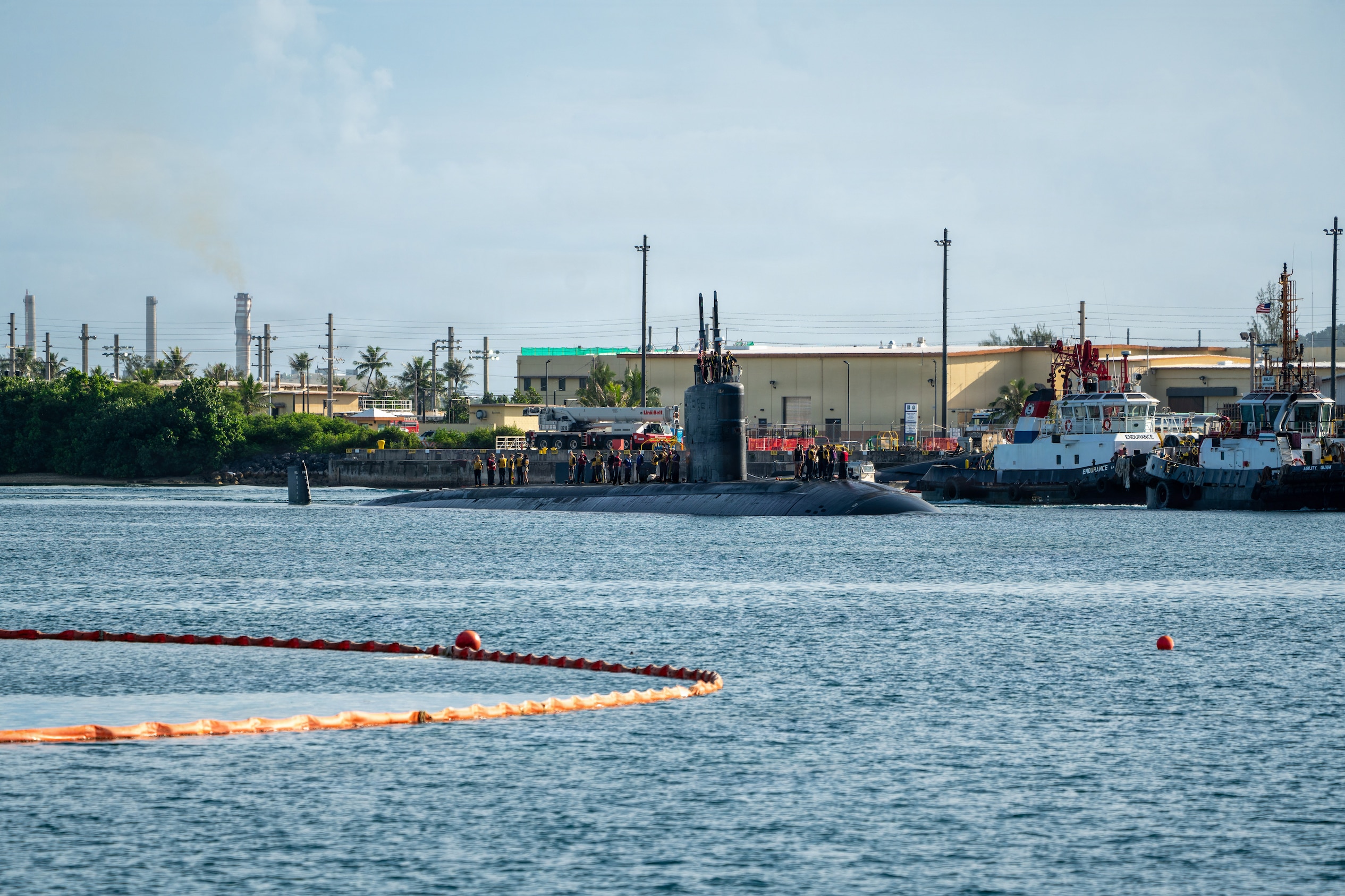 NAVAL BASE GUAM (Oct. 12, 2025) Los Angeles-class fast-attack submarine USS Tucson (SSN 770) transits Apra Harbor Naval Base Guam, Oct. 12. Tucson, homeported in Pearl Harbor, Hawaii, and assigned to Submarine Squadron 7, is conducting routine operations in the U.S. 7th Fleet area of operations. U.S. 7th Fleet is the U.S. Navy’s largest forward-deployed numbered fleet and routinely interacts and operates with allies and partners in preserving a free and open Indo-Pacific region. (U.S. Navy photo by Lt. James Caliva)