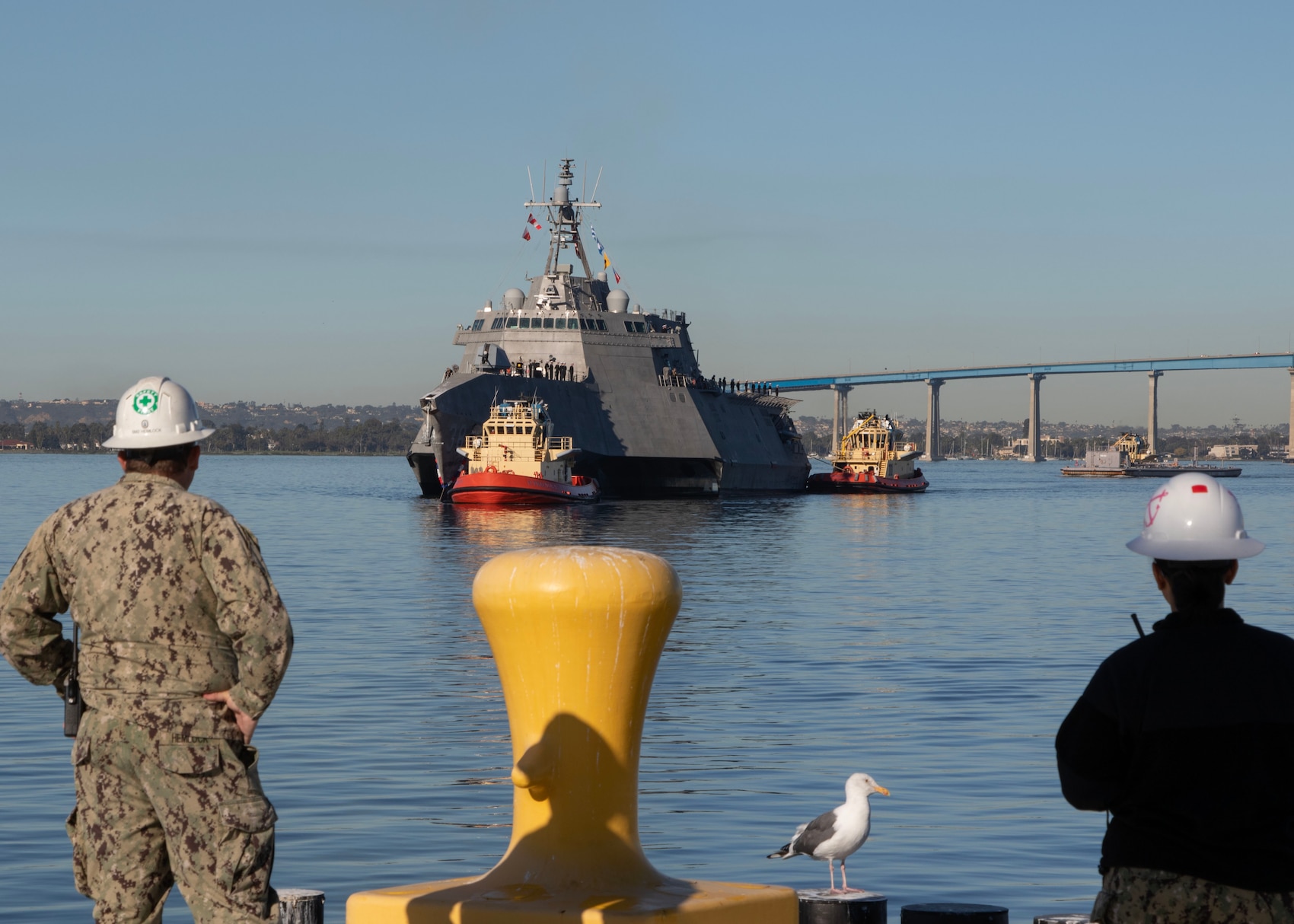 Independence-variant littoral combat ship USS Pierre (LCS 38) transits through San Diego Bay as it arrives at its homeport of San Diego for the first time, Dec. 5, 2025. Pierre, the second U.S. Navy ship to bear this name, commissioned in Panama City, Florida, Nov. 15, as the final Independence-variant LCS. Littoral combat ships are fast, optimally-manned, mission-tailored surface combatants that operate in near-shore and open-ocean environments, winning against 21st-century coastal threats. (U.S. Navy photo by Mass Communication Specialist 1st Class Josh Cote)