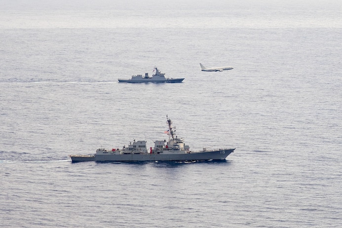 251210-N-KW492-1163 South China Sea (Dec. 10, 2025) – U.S. Navy P-8A Poseidon, assigned to Patrol Squadron (VP) 45, executes a low-altitude flyover as U.S. Navy Arleigh Burke-class guided-missile destroyer USS Rafael Peralta (DDG 115) steams in formation with Philippine Navy Jose Rizal-class frigate BRP Jose Rizal (FF 150) in the South China Sea, Dec. 10. Within the U.S. 7th Fleet area of operations, Commander, Task Force (CTF) 76 is responsible for conducting expeditionary warfare operations with Navy and Marine Corps capabilities to support theater contingencies that range from crisis response to full combat operations. (U.S. Navy photo by Mass Communication Specialist 1st Class Ryre Arciaga)