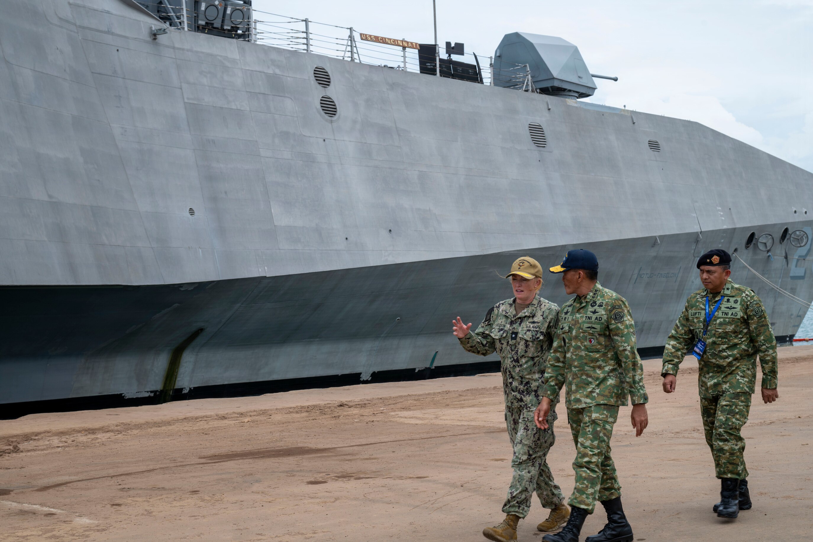 U.S. Navy Rear Adm. Katie Sheldon, left, vice commander, U.S. 7th Fleet, speaks to Indonesian National Armed Forces Lieutenant General Tri Budi Utomo, Secretary General, Ministry of Defense, center, during the Association of Southeast Asian Nations (ASEAN)-U.S. Maritime Exercise (AUMX) 2025, in Batam, Indonesia, Dec. 10, 2025. This is the second iteration of AUMX, designed to promote shared commitments to maritime partnerships, security, and stability in Southeast Asia. (U.S. Navy photo by Mass Communication Specialist 2nd Class Anthony Robledo)