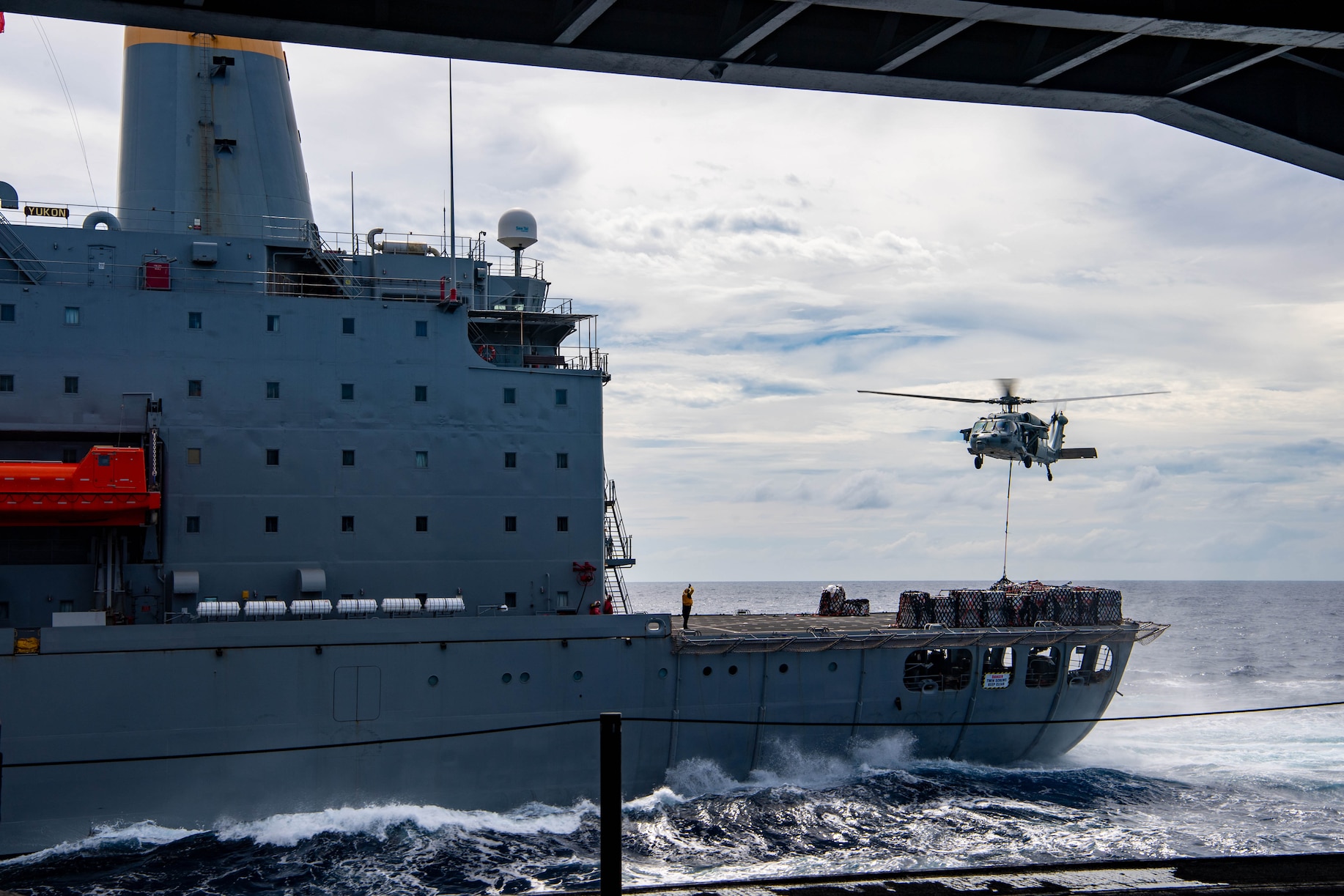 An MH-60S Sea Hawk, attached to Helicopter Sea Combat Squadron (HSC) 6, conducts a vertical replenishment-at-sea with Henry J. Kaiser-class fleet replenishment oiler USNS Yukon (T-AO 202) and aircraft carrier USS Nimitz (CVN 68) in the South China Sea, Nov. 15, 2025. Nimitz is underway in the U.S. 7th Fleet area of operations on a scheduled deployment, demonstrating the U.S. Navy's unwavering commitment to a free and open Indo-Pacific. (U.S. Navy photo by Mass Communication Specialist 3rd Class Edward Jacome)