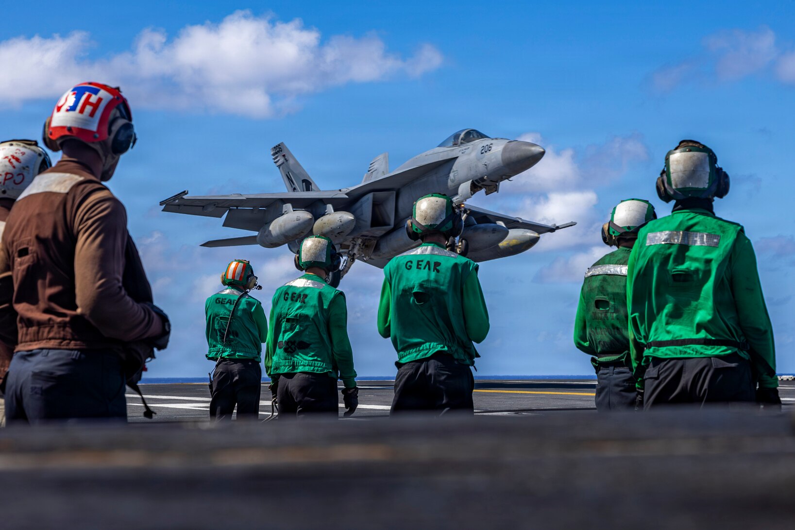 An F/A-18E Super Hornet, attached to Strike Fighter Squadron (VFA) 14, prepares to make an arrested landing on the flight deck of Nimitz-class aircraft carrier USS Abraham Lincoln (CVN 72) in the Philippine Sea, Dec. 16, 2025. The Abraham Lincoln Carrier Strike Group is underway conducting routine operations in the U.S. 7th Fleet area of operations. Units assigned to 7th Fleet conduct regular Indo-Pacific patrols to deter aggression, strengthen alliances and partnerships, and advance peace through strength. (U.S. Navy photo by Mass Communication Specialist Seaman Daniel Kimmelman)