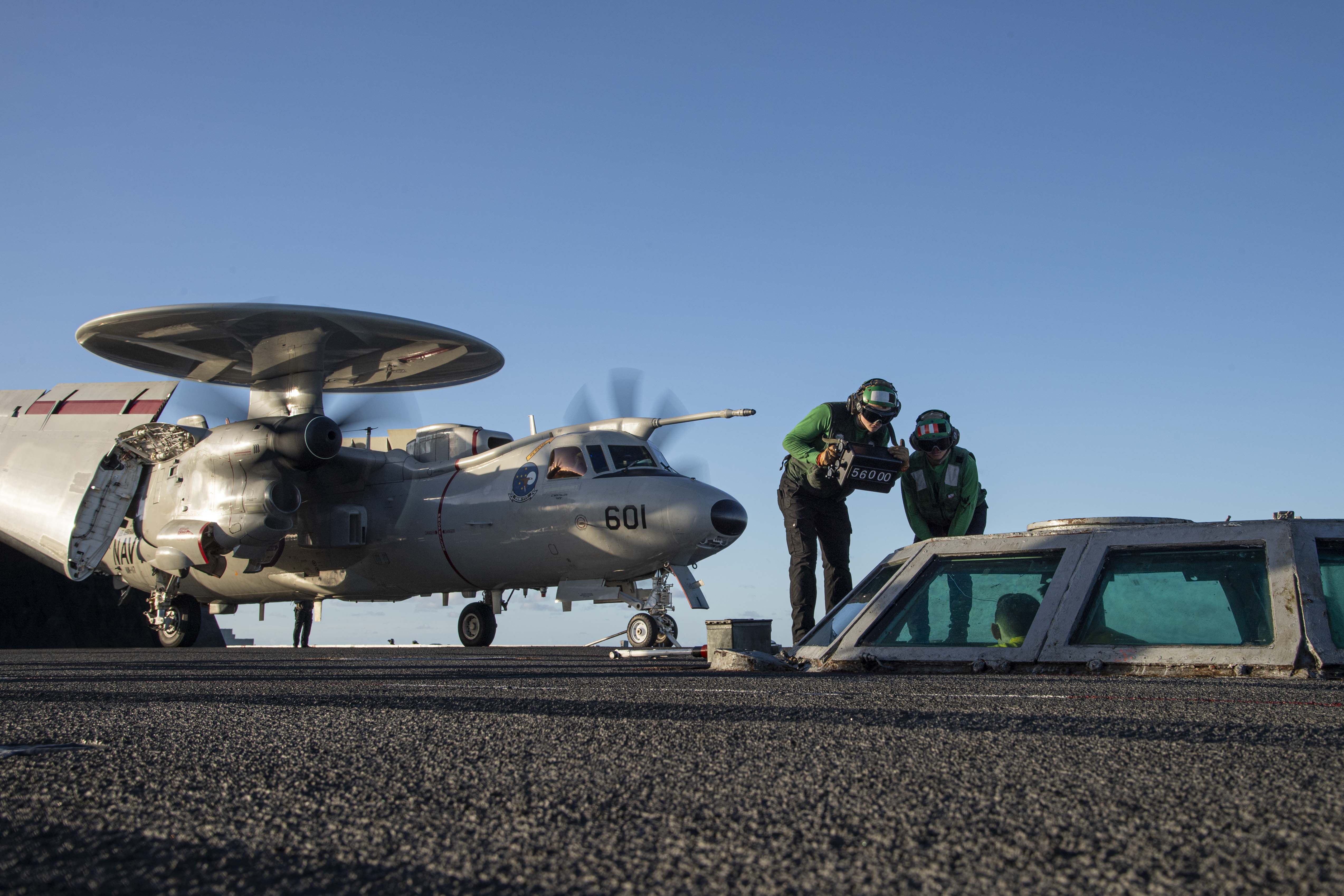 U.S. Navy Sailors conduct preflight checks on an E-2D Hawkeye, attached to Airborne Command & Control Squadron (VAW) 117, on the flight deck of Nimitz-class aircraft carrier USS Abraham Lincoln (CVN 72) in the Philippine Sea, Dec. 19, 2025. The Abraham Lincoln Carrier Strike Group is underway conducting routine operations in the U.S. 7th Fleet area of operations. Units assigned to U.S. 7th Fleet conduct regular Indo-Pacific patrols to deter aggression, strengthen alliances and partnerships, and advance peace through strength. (U.S. Navy photo by Mass Communication Specialist 3rd Class Nathaly Cruz)