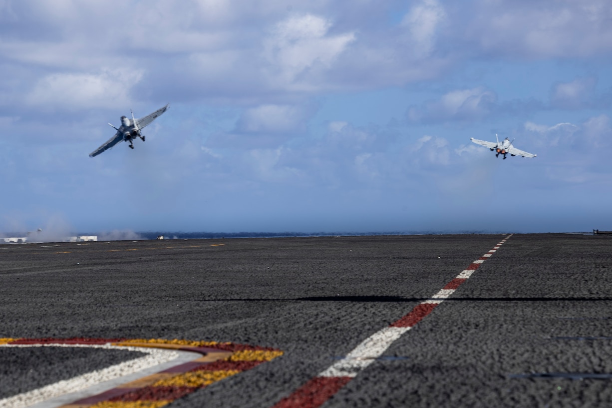 Two F/A-18F Super Hornets, attached to Strike Fighter Squadron (VFA) 41, launch from the flight deck of Nimitz-class aircraft carrier USS Abraham Lincoln (CVN 72) in the Philippine Sea, Dec. 17, 2025. The Abraham Lincoln Carrier Strike Group is underway conducting routine operations in the U.S. 7th Fleet area of operations. (U.S. Navy photo by Mass Communication Specialist Seaman Daniel Kimmelman)