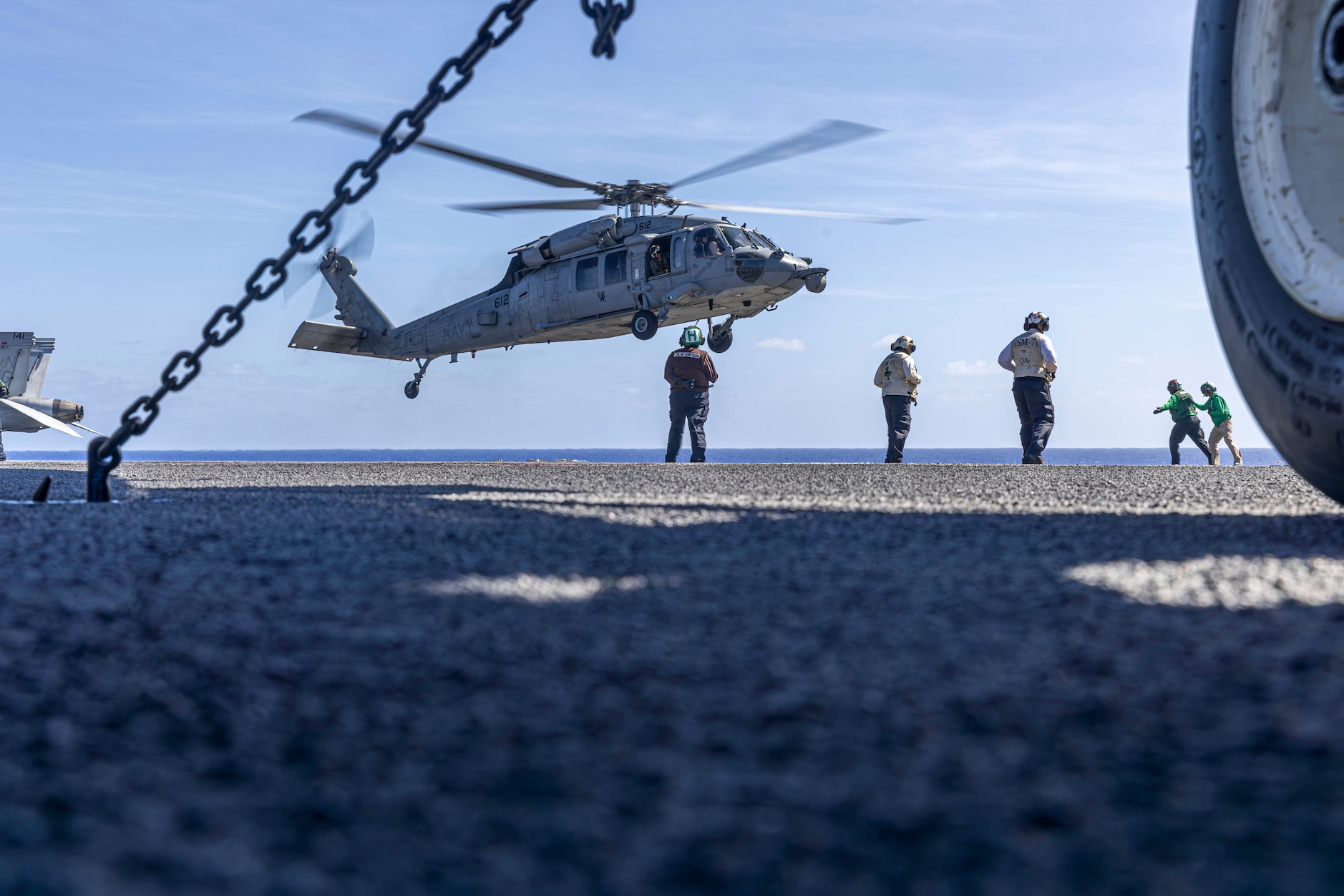 An MH-60R Sea Hawk, attached to Helicopter Sea Combat Squadron (HSC) 14, takes off from the flight deck of Nimitz-class aircraft carrier USS Abraham Lincoln (CVN 72) in the Philippine Sea, Dec. 22, 2025. The Abraham Lincoln Carrier Strike Group is underway conducting routine operations in the U.S. 7th Fleet area of operations. (U.S. Navy photo by Mass Communication Specialist Seaman Daniel Kimmelman)