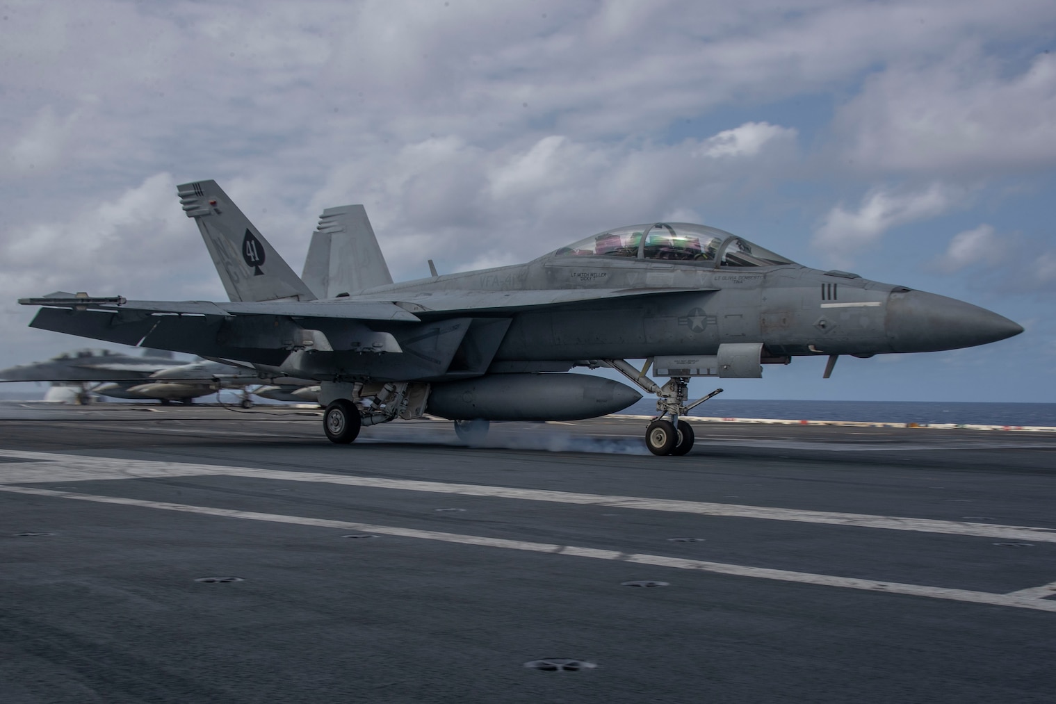 An F/A-18F Super Hornet, attached to Strike Fighter Squadron (VFA) 41, makes an arrested landing on the flight deck of Nimitz-class aircraft carrier USS Abraham Lincoln (CVN 72) in the South China Sea, Dec. 31, 2025. The Abraham Lincoln Carrier Strike Group is underway conducting routine operations in the U.S. 7th Fleet area of operations. Units assigned to U.S. 7th Fleet conduct regular Indo-Pacific patrols to deter aggression, strengthen alliances and partnerships, and advance peace through strength. (U.S. Navy photo by Mass Communication Specialist Seaman Apprentice Cesar Zavala)