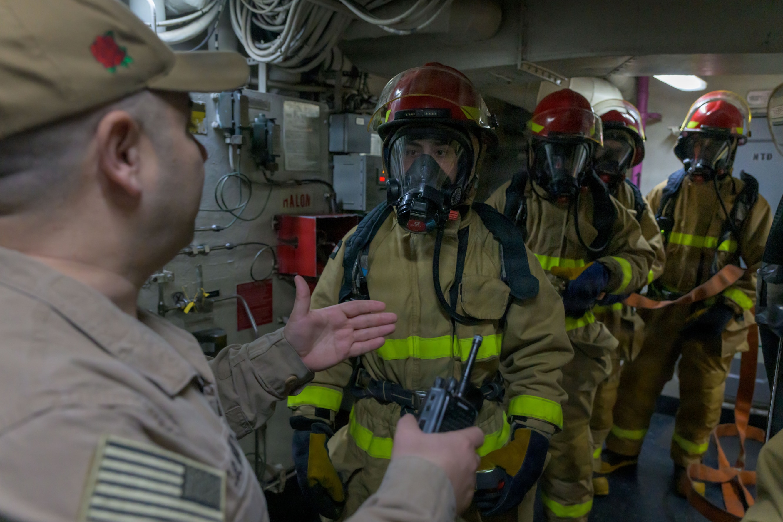 SAN DIEGO (Jan. 4, 2026) – U.S. Navy Sailors conduct training during a damage control drill aboard Nimitz-class aircraft carrier USS Theodore Roosevelt (CVN 71), Jan. 4. Theodore Roosevelt, the flagship of Carrier Strike Group 9, is currently pierside at Naval Air Station North Island in its homeport of San Diego. (U.S. Navy photo by Mass Communication Specialist 2nd Class Ikia Walker)