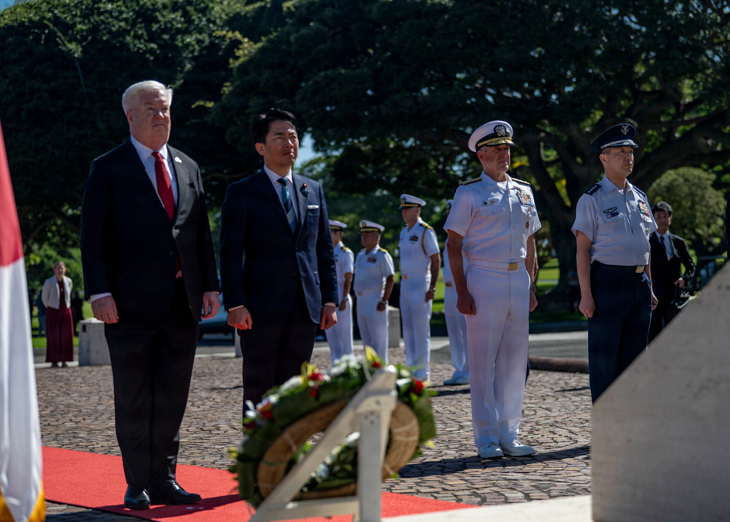 From left to right: U.S. Ambassador to Japan George Glass; Japan’s Minister of Defense, Shinjirō Koizumi; Adm. Steve Koehler, commander, U.S. Pacific Fleet; and Gen. Hiroaki Uchikura, chief of staff, Japan Air Self-Defense Force; stand at attention before the playing of the national anthem during a wreath laying ceremony at the National Memorial of the Pacific in Honolulu, Jan. 12, 2025. (U.S. Navy photo by Mass Communication Specialist 2nd Class Jeremy R. Boan)