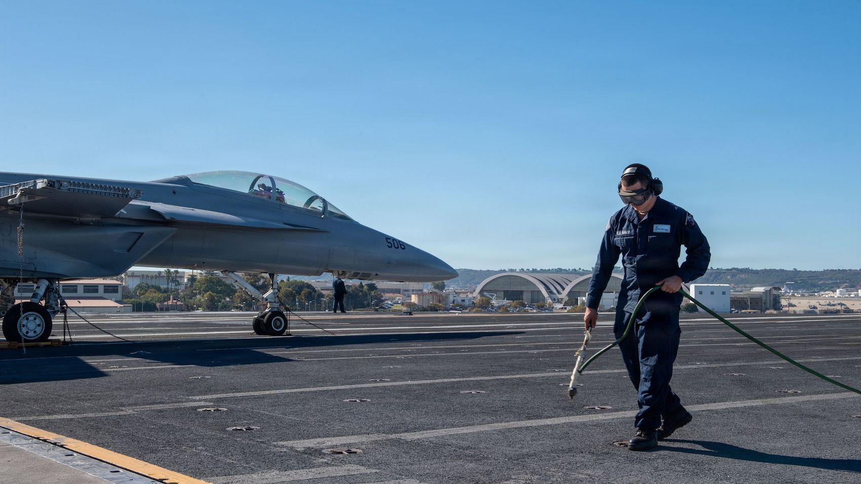 SAN DIEGO (Jan. 14, 2026) – U.S. Navy Airman Gerado Hernandez cleans the pad eyes on the flight deck of Nimitz-class aircraft carrier USS Theodore Roosevelt (CVN 71) as the ship departs from San Diego, Jan. 14. Theodore Roosevelt, flagship of Carrier Strike Group (CSG) 9, is underway conducting exercises to bolster strike group readiness and capability in the U.S. 3rd Fleet area of operations. (U.S. Navy photo by Mass Communication Specialist Seaman Maddix Almeyda)