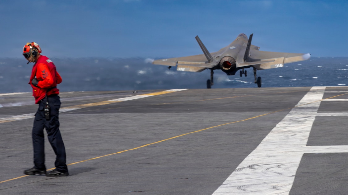 An F-35C Lightning II, attached to Marine Fighter Attack Squadron (VMFA) 314, launches from the flight deck of Nimitz-class aircraft carrier USS Abraham Lincoln (CVN 72) in the South China Sea, Jan. 9, 2026. The Abraham Lincoln Carrier Strike Group is underway conducting routine operations in the U.S. 7th Fleet area of operations. Units assigned to U.S. 7th Fleet conduct regular Indo-Pacific patrols to deter aggression, strengthen alliances and partnerships, and advance peace through strength. (U.S. Navy photo by Mass Communication Specialist Seaman Samuel Evarts)