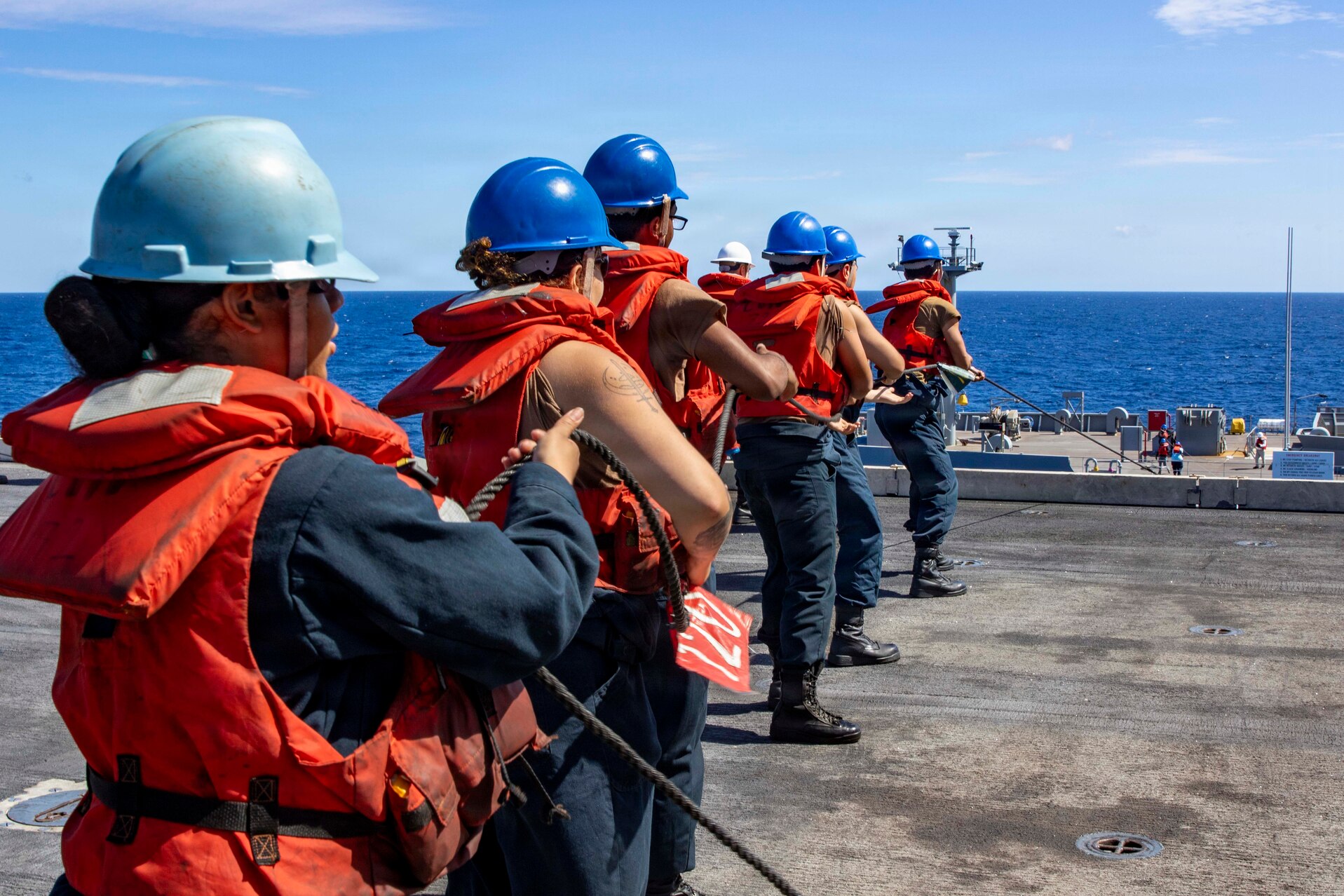 U.S. Navy Sailors heave a line on the flight deck of Nimitz-class aircraft carrier USS Abraham Lincoln (CVN 72) during a replenishment-at-sea with Henry J. Kaiser-class fleet replenishment oiler USNS Yukon (T-AO-202) in the South China Sea, Jan. 12, 2026. The Abraham Lincoln Carrier Strike Group is underway conducting routine operations in the U.S. 7th Fleet area of operations. Units assigned to U.S. 7th Fleet conduct regular Indo-Pacific patrols to deter aggression, strengthen alliances and partnerships, and advance peace through strength. (U.S. Navy photo by Mass Communication Specialist Seaman Zoe Simpson)