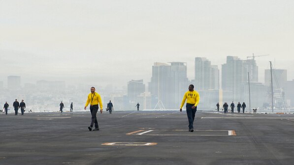SAN DIEGO (Jan. 21, 2026) – U.S. Navy Aviation Boatswains Mate (Handling) 1st Class Stefern Jones, left, and Aviation boatswains Mate (Handling) 1st Class Anthony Saunders walk the flight deck of Nimitz-class aircraft carrier USS Theodore Roosevelt (CVN 71) as the ship departs from San Diego, Jan. 21, 2026. Theodore Roosevelt, flagship of Carrier Strike Group (CSG) 9, is underway conducting exercises to bolster strike group readiness and capability in the U.S. 3rd Fleet area of operations. (U.S. Navy photo by Mass Communication Specialist Seaman Maddix Almeyda)