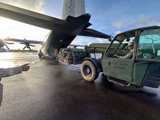 TINIAN, Northern Mariana Islands (Jan. 21, 2026) Equipment Operator 2nd Class Lyncoln KestlerReyes, assigned to Naval Mobile Construction Battalion (NMCB) 133, moves equipment for aircraft fueling in support of Marine Wing Support Squadron 171 on Tinian of the Northern Mariana Islands, Jan. 21. NCMB-133 is deployed under Commander, Task Force 75, which executes command and control of assigned Navy Expeditionary Combat Forces across the U.S. 7th Fleet area of operations to defend U.S., allied, and partner interests. (U.S. Navy photo by Builder 3rd Class Caroline Ballay)