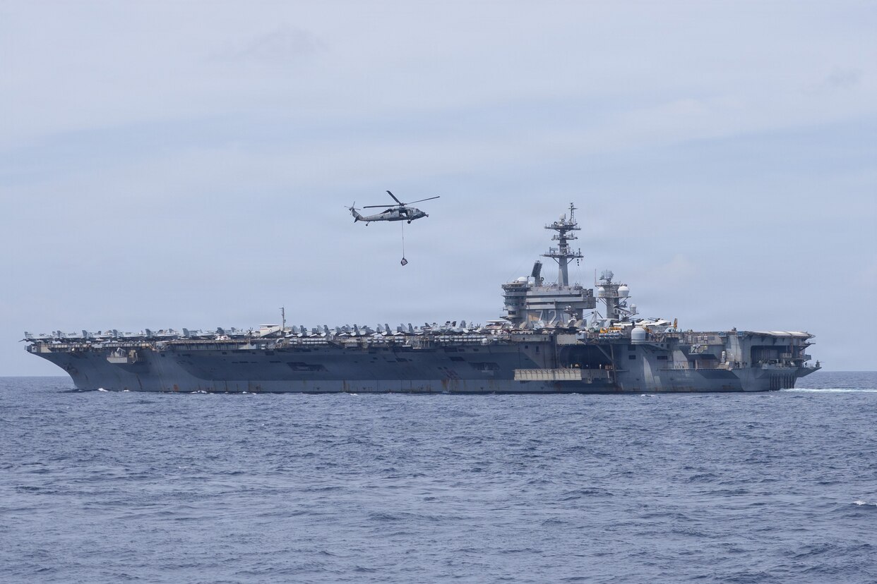 U.S. Navy Nimitz-class aircraft carrier USS Abraham Lincoln (CVN 72) conducts a vertical replenishment with fleet replenishment oiler USNS Henry J. Kaiser (T-AO-187) in the South China Sea, Jan. 17, 2026. Abraham Lincoln, assigned to the Abraham Lincoln Carrier Strike Group, is underway conducting routine operations in the U.S. 7th Fleet area of operations. Units assigned to U.S. 7th Fleet conduct regular Indo-Pacific patrols to deter aggression, strengthen alliances and partnerships, and advance peace through strength. (U.S. Navy photo by Mass Communication Specialist 2nd Class Jordan Steis)