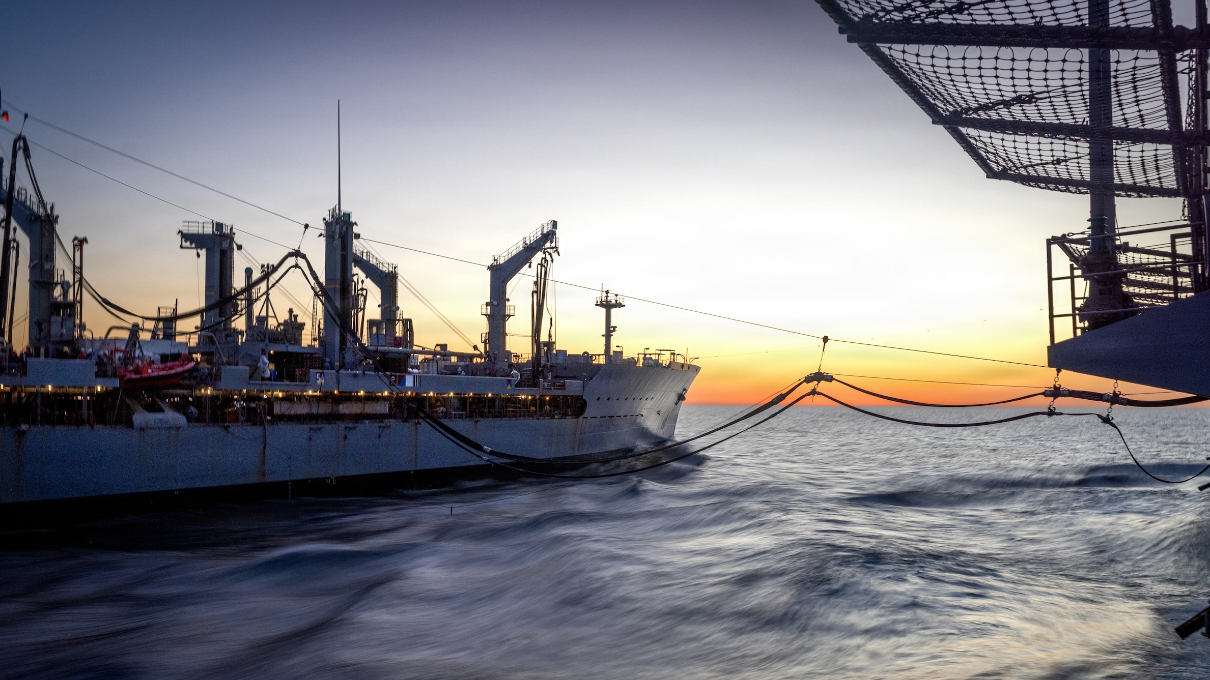 Henry J. Kaiser-class underway replenishment oiler USNS Patuxent (T-AO 201), left, refuels Whidbey Island-class dock landing ship USS Comstock (LSD 45) during a replenishment-at-sea operation in the Pacific Ocean, Jan. 31, 2026. The 11th Marine Expeditionary Unit is currently underway aboard the Boxer Amphibious Ready Group in the U.S. 3rd Fleet area of operations conducting integrated training that enhances lethality and warfighting readiness. (U.S. Marine Corps photo by Sgt. Trent A. Henry)