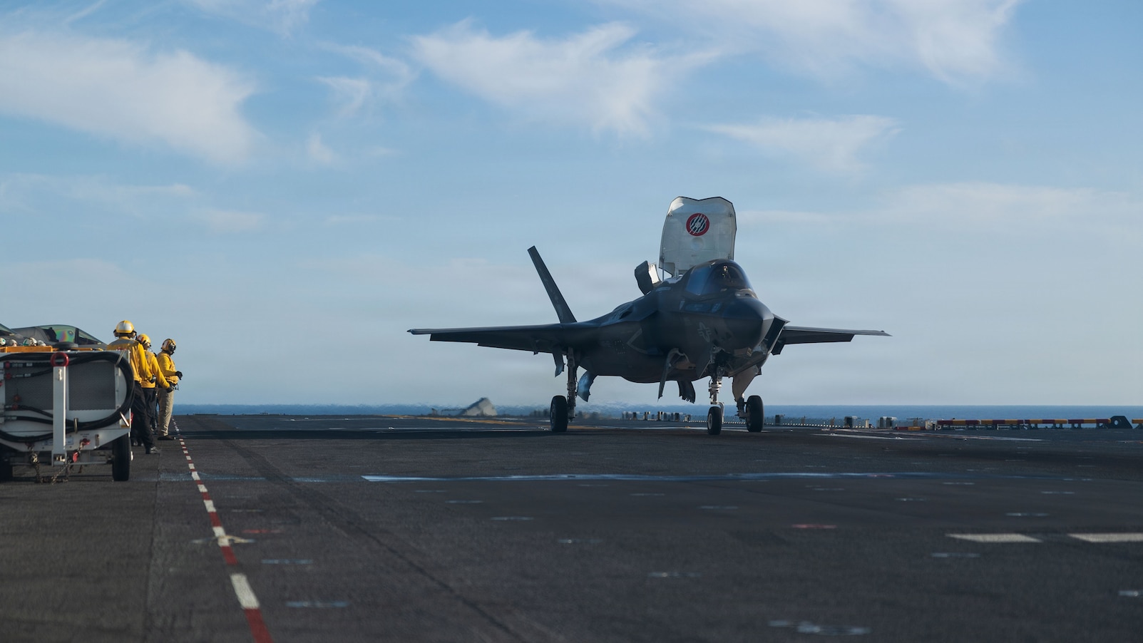 A U.S. Marine Corps F-35B Lightning II, with Marine Fighter Attack Squadron (VMFA) 122, 11th Marine Expeditionary Unit, stages on the flight deck prior to launching from Wasp-class amphibious assault ship USS Boxer (LHD 4) in the Pacific Ocean, Feb. 1, 2026. The 11th MEU is currently underway aboard the Boxer Amphibious Ready Group in the U.S. 3rd Fleet area of operations conducting integrated training that enhances lethality and warfighting readiness. (U.S. Marine Corps photo by Lance Cpl. Nicole Stuart)
