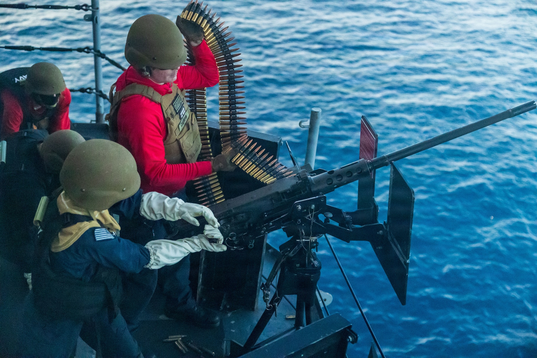 Gunners Mate 3rd Class Kimberly Holden, left, and Gunners Mate 1st class Carlos Cabrera, both assigned to Wasp-class amphibious assault ship USS Boxer (LHD 4), reload a .50-caliber machine gun during a small craft action team drill in the Pacific Ocean, Feb. 2, 2026. The 11th Marine Expeditionary Unit is currently underway aboard the Boxer Amphibious Ready Group in the U.S. 3rd Fleet area of operations conducting integrated training that enhances lethality and warfighting readiness. (U.S. Marine Corps photo by Lance Cpl. Nicole Stuart)