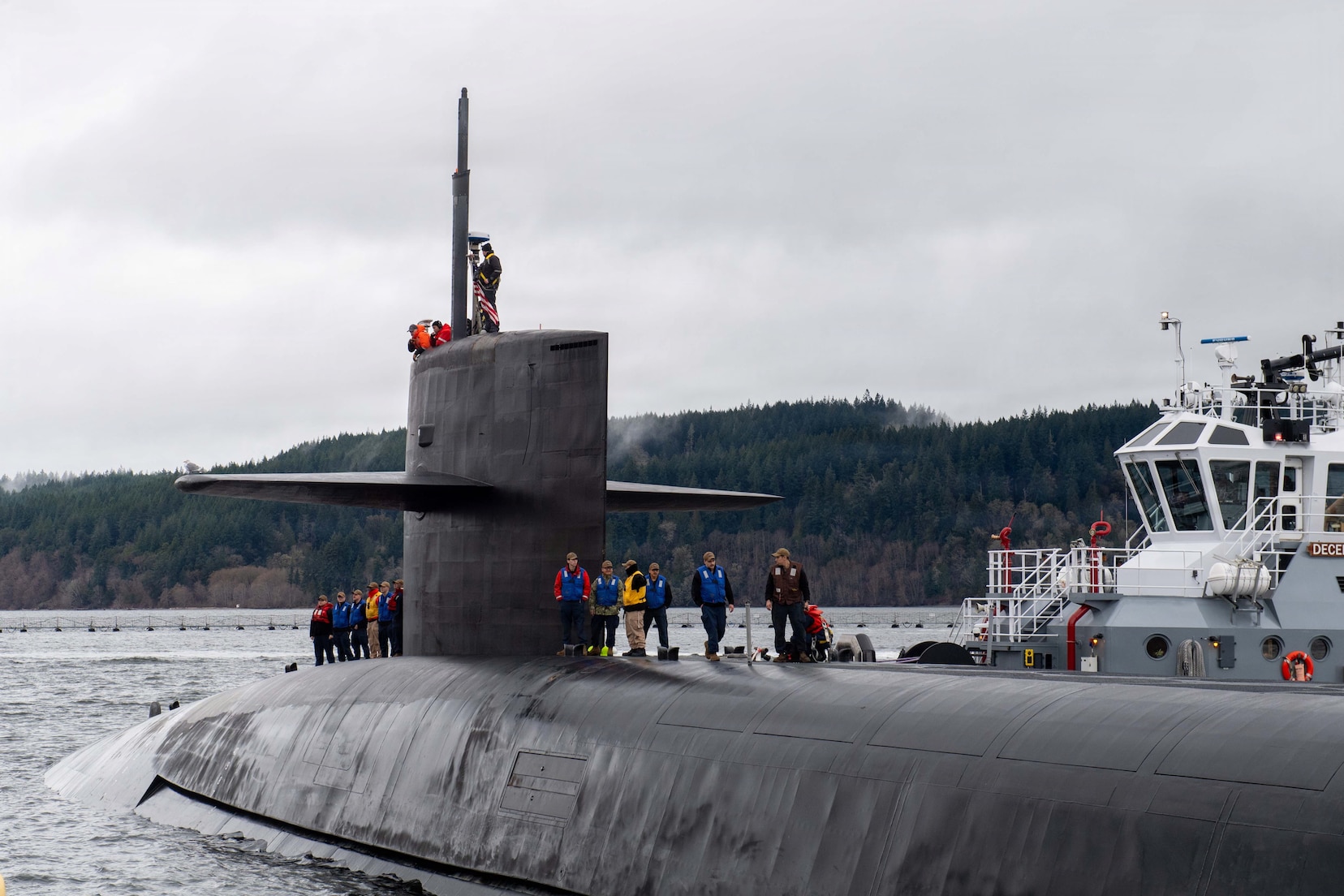 SILVERDALE, Wash. (Feb. 2, 2025) Ohio-class ballistic missile submarine USS Maine (SSBN 741) returns to Naval Base Kitsap-Bangor following a routine strategic deterrent patrol, Feb. 2, 2025. Maine is assigned to Commander, Submarine Group (SUBGRU) 9, which exercises operational and administrative control authority for assigned submarine commands and units in the Pacific Northwest providing oversight for shipboard training, personnel, supply and material readiness of SSBNs and their crews. SUBGRU-9 is also responsible for nuclear submarines undergoing conversion or overhaul at Puget Sound Naval Shipyard in Bremerton. (U.S. Navy photo by Mass Communication Specialist 1st Class Ryan Riley)