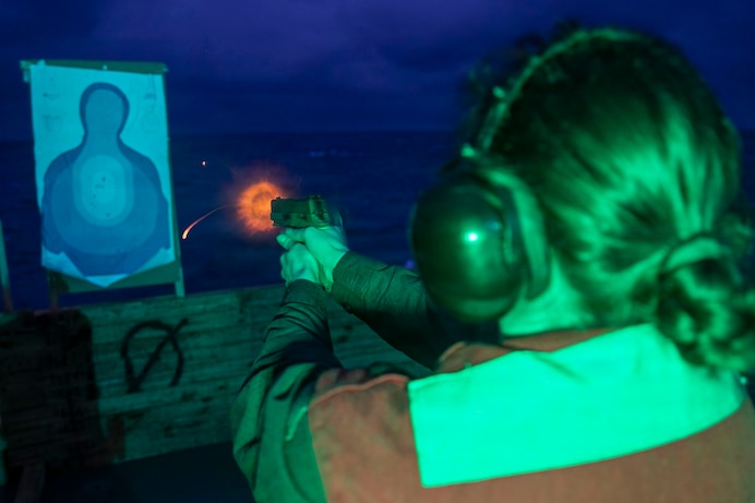 Cryptologic Technician (Collection) 2nd Class Caitlyn Langham fires an M18 pistol during a low-light gun shoot aboard America-class amphibious assault ship USS Tripoli (LHA 7), Feb. 7, 2026. Tripoli is underway conducting routine operations in the U.S. 7th Fleet area of operations. U.S. 7th Fleet is the U.S. Navy’s largest forward-deployed numbered fleet and routinely interacts and operates with allies and partners in preserving a free and open Indo-Pacific region. (U.S. Navy photo by Mass Communication Specialist 3rd Class Paul LeClair)
