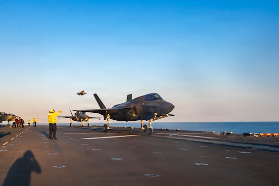 Sailors direct the landing of multiple F-35B Lighting II, attached to Marine Fighter Attack Squadron (VMFA) 121, during flight operations aboard America-class amphibious assault ship USS Tripoli (LHA 7), Feb. 5, 2026. Tripoli Amphibious Ready Group (ARG), composed of Tripoli, San Antonio-class amphibious transport dock ships USS New Orleans (LPD 18) and USS San Diego (LPD 22), along with the 31st Marine Expeditionary Unit (MEU), are underway conducting routine operations in the U.S. 7th Fleet area of operations. U.S. 7th Fleet is the U.S. Navy’s largest forward-deployed numbered fleet, routinely interacts and operates with allies and partners in preserving a free and open Indo-Pacific.. (U.S. Navy photo by Mass Communication Specialist 3rd Class Angel Conde)