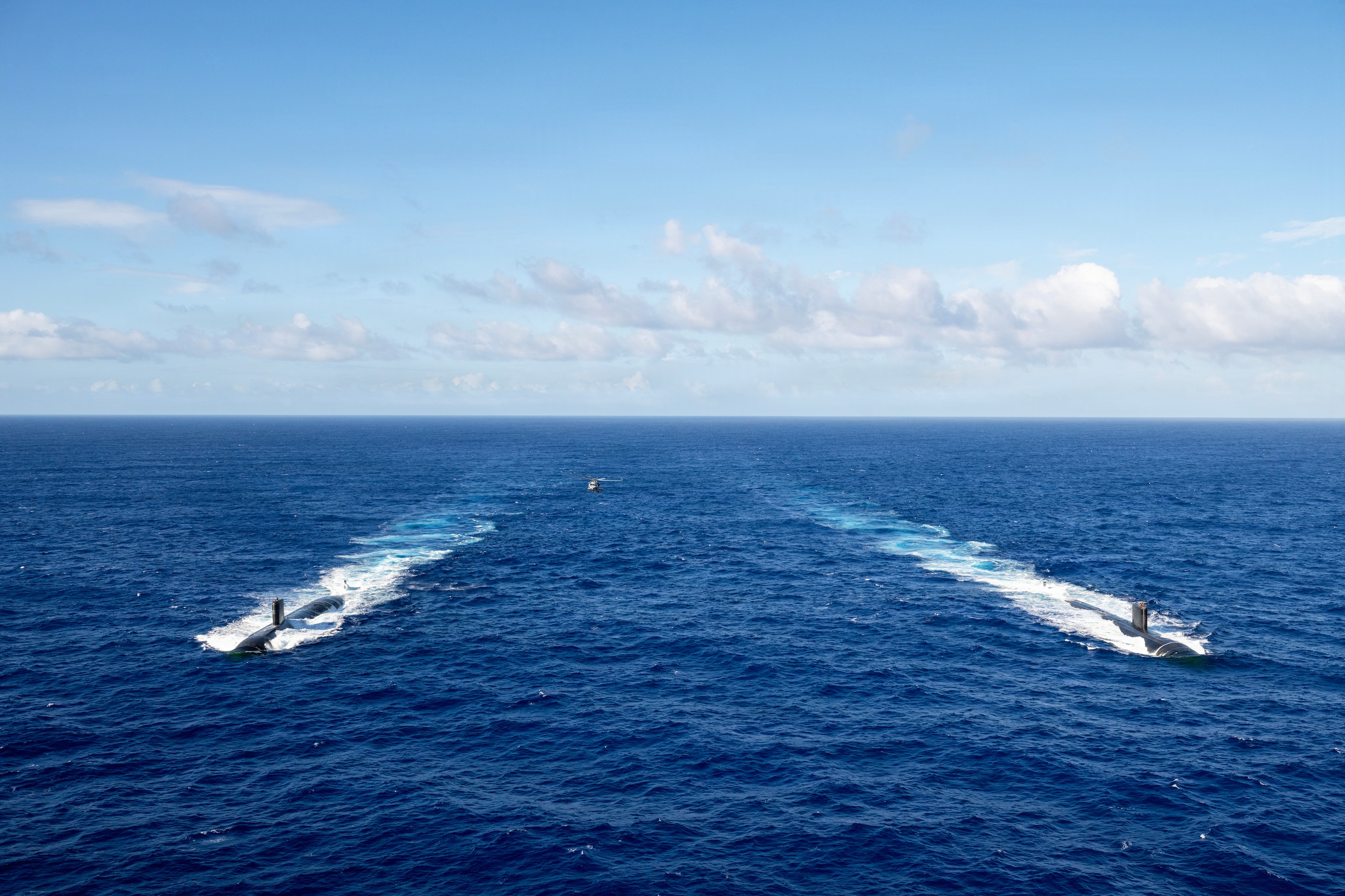 PACIFIC OCEAN (Dec. 17, 2025) - Los Angeles-class fast-attack submarines USS Annapolis (SSN 760), left, and USS Asheville (SSN 758) steam in formation with an MH-60S Sea Hawk, attached to Helicopter Sea Combat Squadron (HSC) 25, in the Indo-Pacific, Dec. 17. Assigned to Commander, Submarine Squadron 15 at Polaris Point, Naval Base Guam, Asheville and Annapolis are two of five fast-attack submarines forward deployed in the Pacific. Renowned for their unparalleled speed, endurance, stealth, and mobility, fast-attack submarines serve as the backbone of the Navy's submarine force, ensuring readiness and agility in safeguarding maritime interests around the world. (U.S. Navy photo by Mass Communication Specialist 1st Class Bryan Mai)