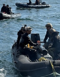 Sailors assigned to Explosive Ordnance Disposal Mobile Unit (EODMU) 5 and Japan Maritime Self-Defense Force (JMSDF) EOD teams launch from the Uraga-class mine countermeasure vessel JS Bungo (MST-464) during unmanned underwater vehicle operations as part of Mine Warfare Exercise (MINEX) 1JA, Feb. 2, 2026. MINEX 1JA is part of a year-long series of bilateral exercise between the U.S. Navy and JMSDF to strengthen interoperability and increase proficiency in mine countermeasure operations. (U.S. Navy photo by Senior Chief Mineman Chris Gonzales Bouton)