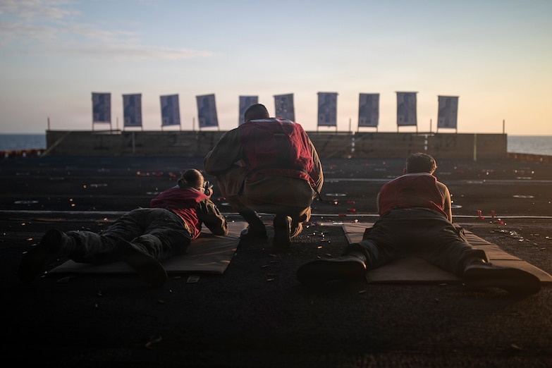 Chief Master-At-Arms Adam Baker, (center), supervises Sailors during a live fire evolution aboard America-class amphibious assault ship USS Tripoli (LHA 7) Feb. 15, 2026. Tripoli is underway conducting routine operations in the U.S. 7th Fleet area of operations. U.S. 7th Fleet, the U.S. Navy’s largest forward-deployed numbered fleet, routinely interacts and operates with allies and partners in preserving a free and open Indo-Pacific region. (U.S. Navy photo by Mass Communication Specialist 3rd Class Colten Bradley)