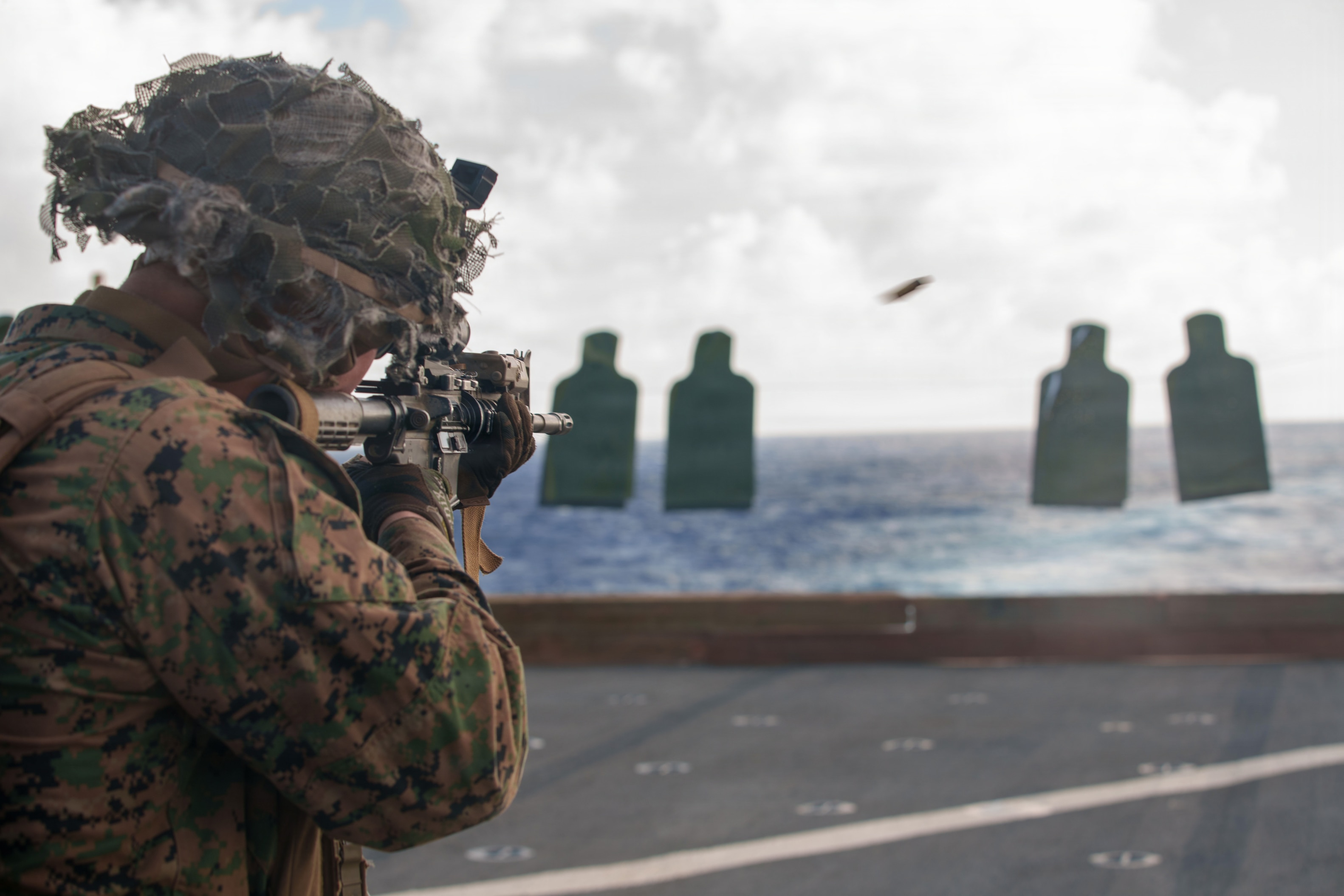 PACIFIC OCEAN (Feb. 10, 2026) - U.S. Marine Corps Lance Cpl. Cole Jerpseth, an amphibious combat vehicle crewman assigned to Task Force Ashland, I Marine Expeditionary Force, fires an M4 carbine at targets during a live-fire deck shoot aboard amphibious dock landing ship USS Ashland (LSD 48) in the Pacific Ocean, Feb. 10. TF Ashland is a flexible, forward-deployed crisis response force led by the 15th Marine Expeditionary Unit. Purpose-built to integrate with allies and partners, TF Ashland supports a free and open Indo-Pacific by providing immediate response capabilities for any contingency. (U.S. Marine Corps photo by Cpl. Kenneth Twaddell)a