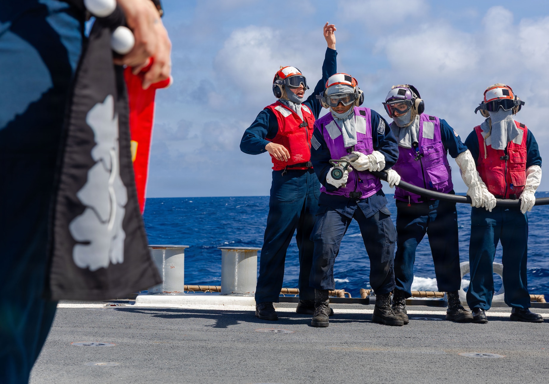U.S. Sailors simulate putting out an aircraft fire on the flight deck of Arleigh Burke-class guided-missile destroyer USS Milius (DDG 69) during a damage control drill in the South China Sea, Feb. 17, 2026. Milius is forward deployed and assigned to Destroyer Squadron (DESRON) 15, the Navy’s largest DESRON and U.S. 7th Fleet’s principal surface force. (U.S. Navy Photo by Mass Communication Specialist 2nd Class Monica Walker)