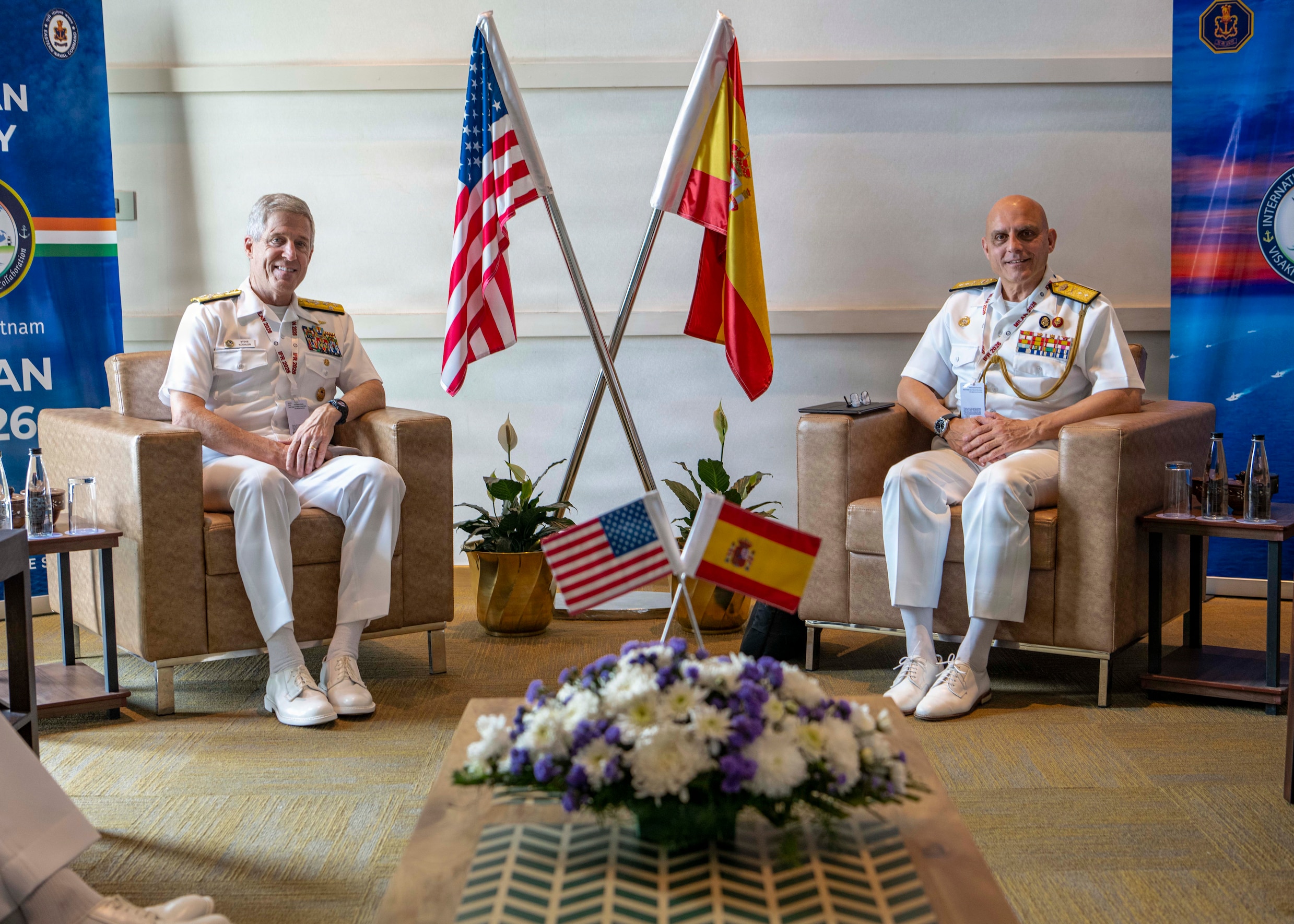 Adm. Steve Koehler, commander, U.S. Pacific Fleet, left, and Vice Adm. Ignacio Paz García, chief of the Plans Division for the Spanish Navy, conduct a bilateral meeting during exercise MILAN 2026 in Visakhapatnam, India, Feb. 17, 2026. Hosted by the Indian Navy, MILAN 2026 is a biennial, multilateral exercise focused on enhancing interaction between professional navies and gaining experience in operations at sea. The visit to India underscored the U.S. commitment to strengthening partnerships for an Indo-Pacific that is secure, free, and prosperous. (U.S. Navy photo by Mass Communication Specialist 2nd Class Jeremy R. Boan)