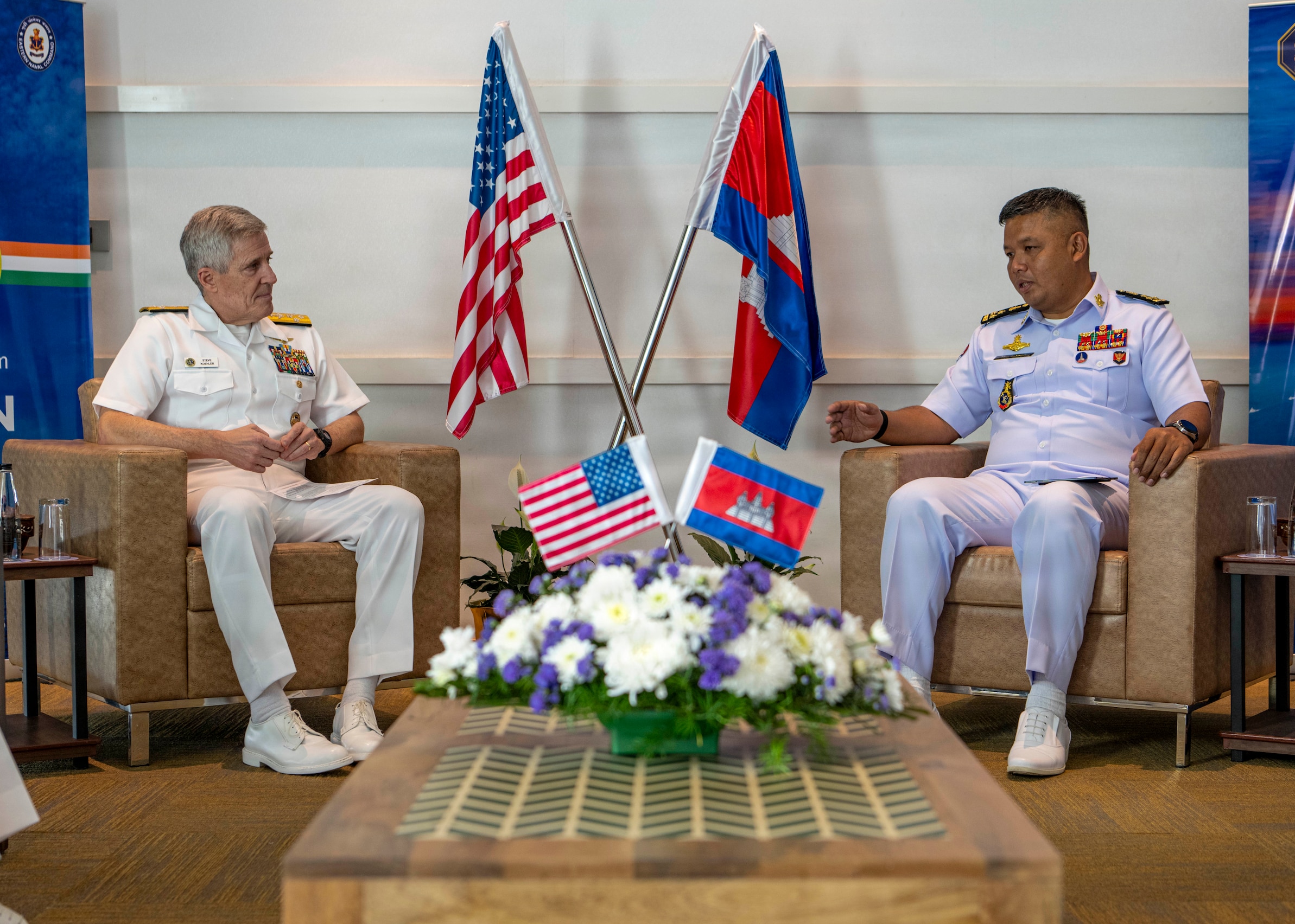 Adm. Steve Koehler, commander, U.S. Pacific Fleet, left, and Vice Adm. Tea Sokha, commander of the Royal Cambodian Navy, conduct a bilateral meeting during exercise MILAN 2026 in Visakhapatnam, India, Feb. 17, 2026. Hosted by the Indian Navy, MILAN 2026 is a biennial, multilateral exercise focused on enhancing interaction between professional navies and gaining experience in operations at sea. The visit to India underscored the U.S. commitment to strengthening partnerships for an Indo-Pacific that is secure, free, and prosperous. (U.S. Navy photo by Mass Communication Specialist 2nd Class Jeremy R. Boan)