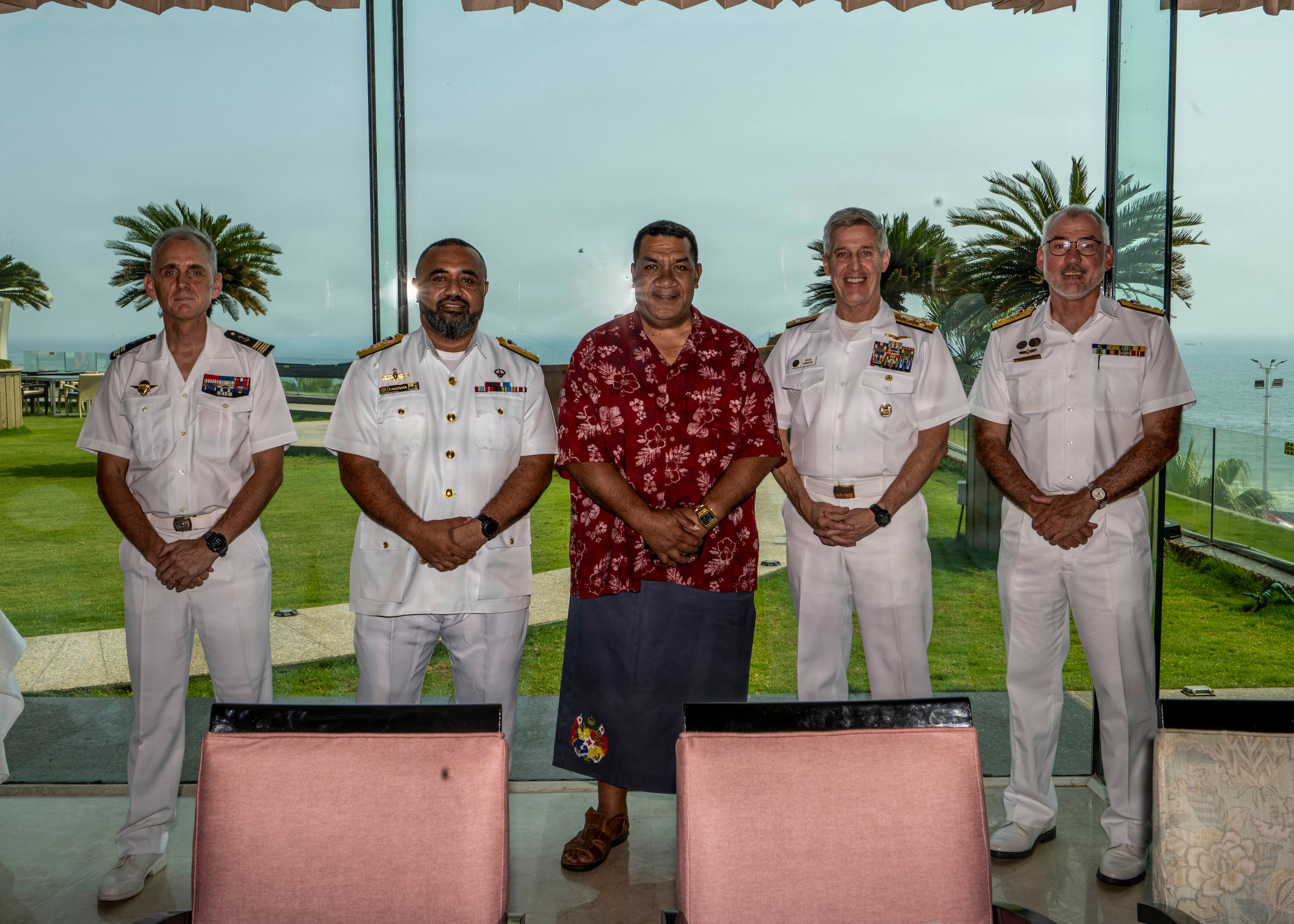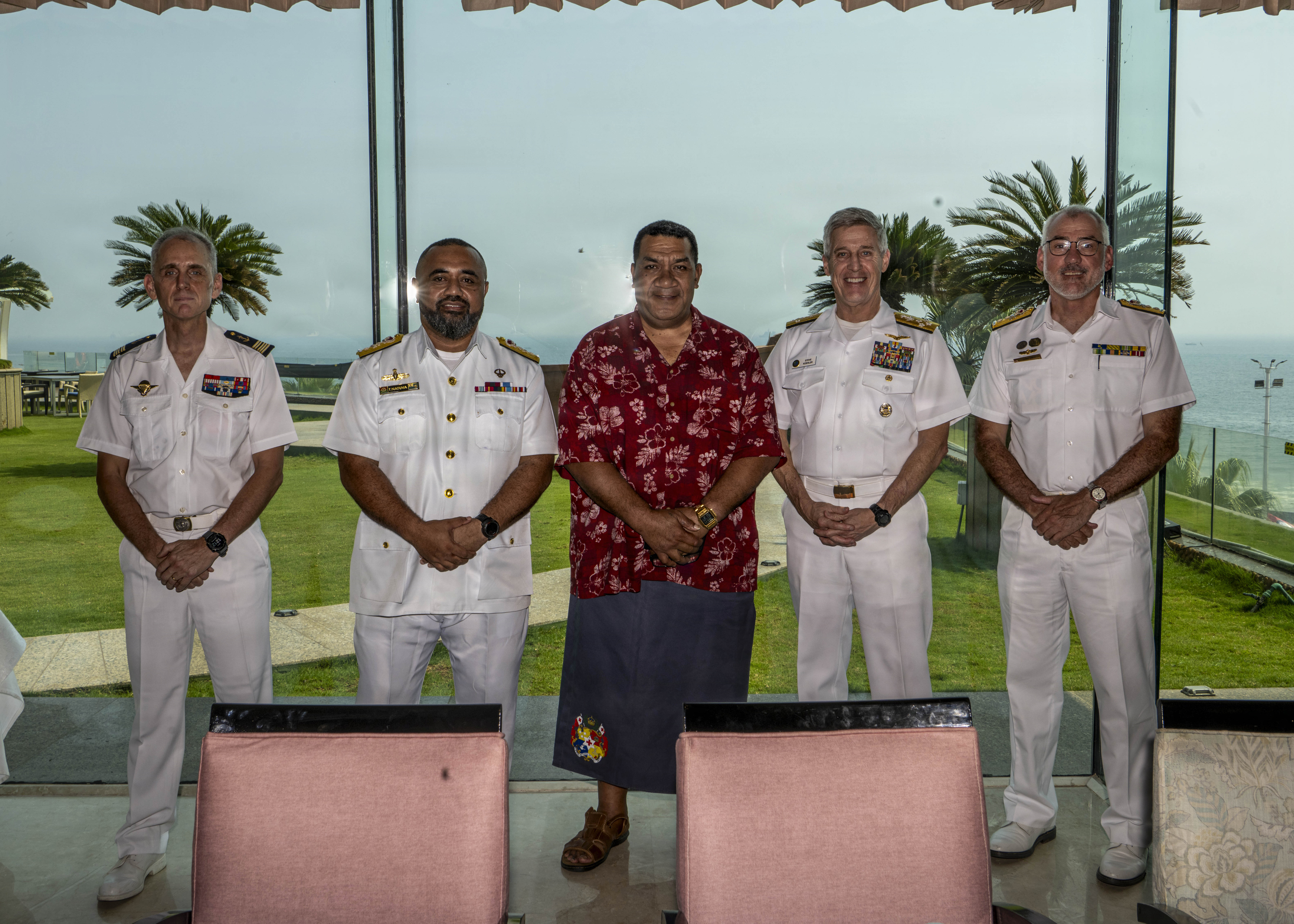From left to right: Capt. Philippe Vauterin, French Navy Liaison Officer to India’s International Fusion Centre — Indian Ocean Region; Commodore Timoci Natuva, commander of the Fiji Navy; Cmdr. Sione Lino, commander of the Royal Tongan Navy; Adm. Steve Koehler, commander of U.S. Pacific Fleet; and Rear Adm. Chris Smith, commander of the Australian Fleet, pose for a photo during a multilateral meeting during exercise MILAN 2026 in Visakhapatnam, India, Feb. 17, 2026. Hosted by the Indian Navy, MILAN 2026 is a biennial, multilateral exercise focused on enhancing interaction between professional navies and gaining experience in operations at sea. The visit to India underscored the U.S. commitment to strengthening partnerships for an Indo-Pacific that is secure, free, and prosperous. (U.S. Navy photo by Mass Communication Specialist 2nd Class Jeremy R. Boan)