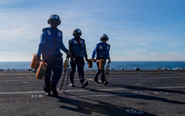 Sailors, assigned to Wasp-class amphibious assault ship USS Boxer (LHD 4), carry chocks and chains on the ship’s flight deck during flight operations, Feb. 23, 2026. Boxer, flagship of the Boxer Amphibious Ready Group, is underway with the 11th MEU in the U.S. 3rd Fleet area of operations conducting integrated training that enhances warfighting capabilities and tactical proficiency. (U.S. Navy photo by Mass Communication Specialist Seaman Dustin Drake)