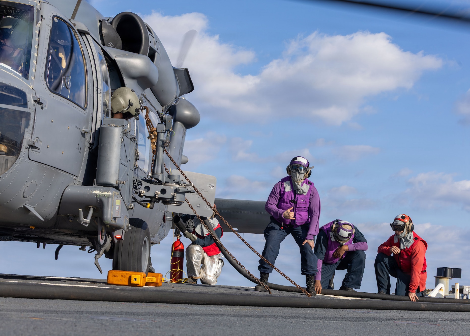U.S. Navy Sailors, assigned to Arleigh Burke-class guided-missile destroyer USS Milius (DDG 69), fuel a U.S. Air Force HH-60W Jolly Green II helicopter, assigned to the 33rd Rescue Squadron, off the coast of Okinawa, Japan, Feb. 13, 2026. Milius is forward deployed and assigned to Destroyer Squadron (DESRON) 15, the Navy’s largest DESRON and U.S. 7th Fleet’s principal surface force. (U.S. Navy Photo by Mass Communication Specialist 2nd Class Monica Walker)