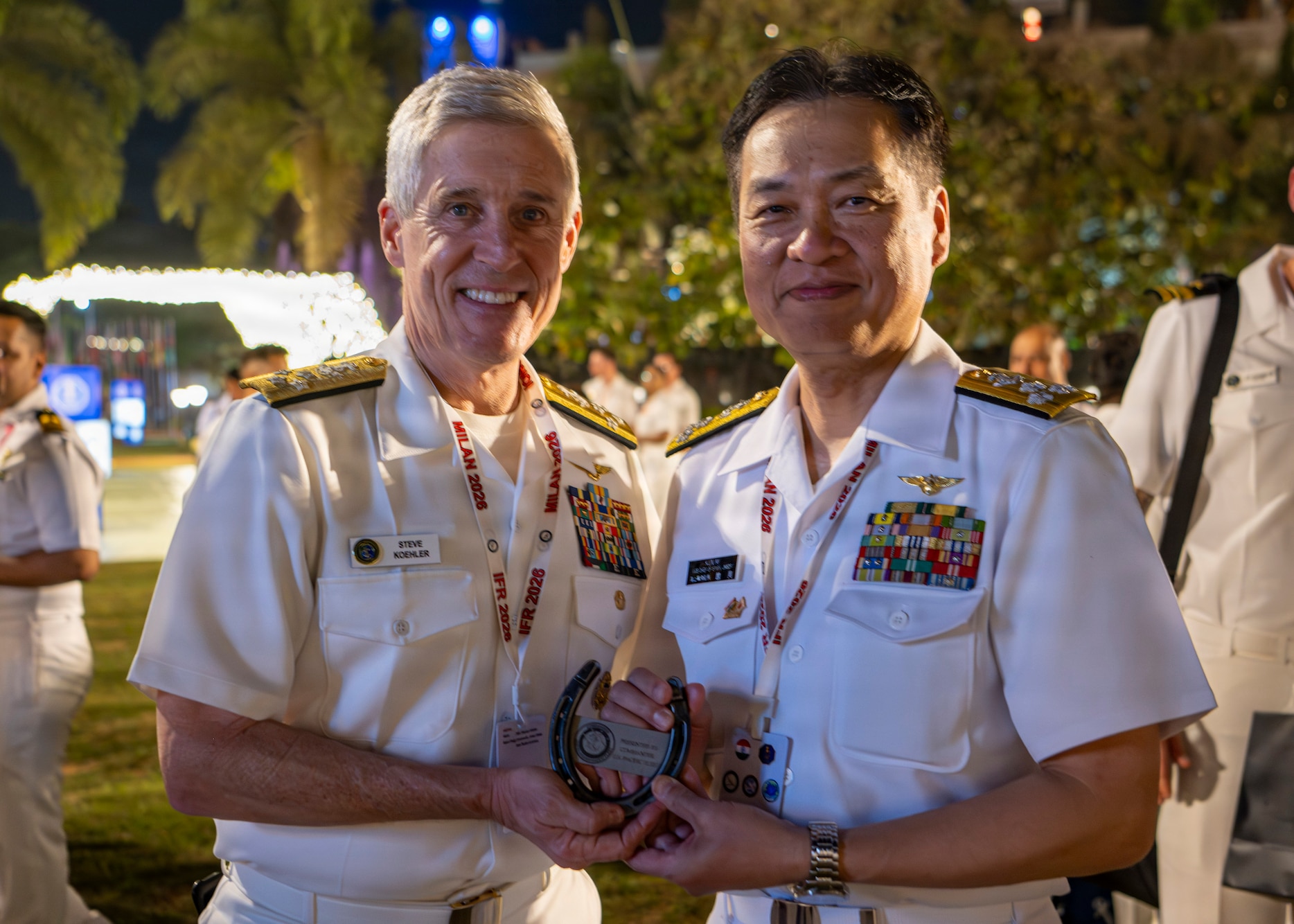 Adm. Steve Koehler, commander, U.S. Pacific Fleet, left, and Vice Adm. Kunimi Yasuhiro, vice chief of staff of Japan Maritime Self-Defense Force, pose for a photo during exercise MILAN 2026 in Visakhapatnam, India, Feb. 18, 2026. Hosted by the Indian Navy, MILAN 2026 is a biennial, multilateral exercise focused on enhancing interaction between professional navies and gaining experience in operations at sea. The visit to India underscored the U.S. commitment to strengthening partnerships for an Indo-Pacific that is secure, free, and prosperous. (U.S. Navy photo by Mass Communication Specialist 2nd Class Jeremy R. Boan)