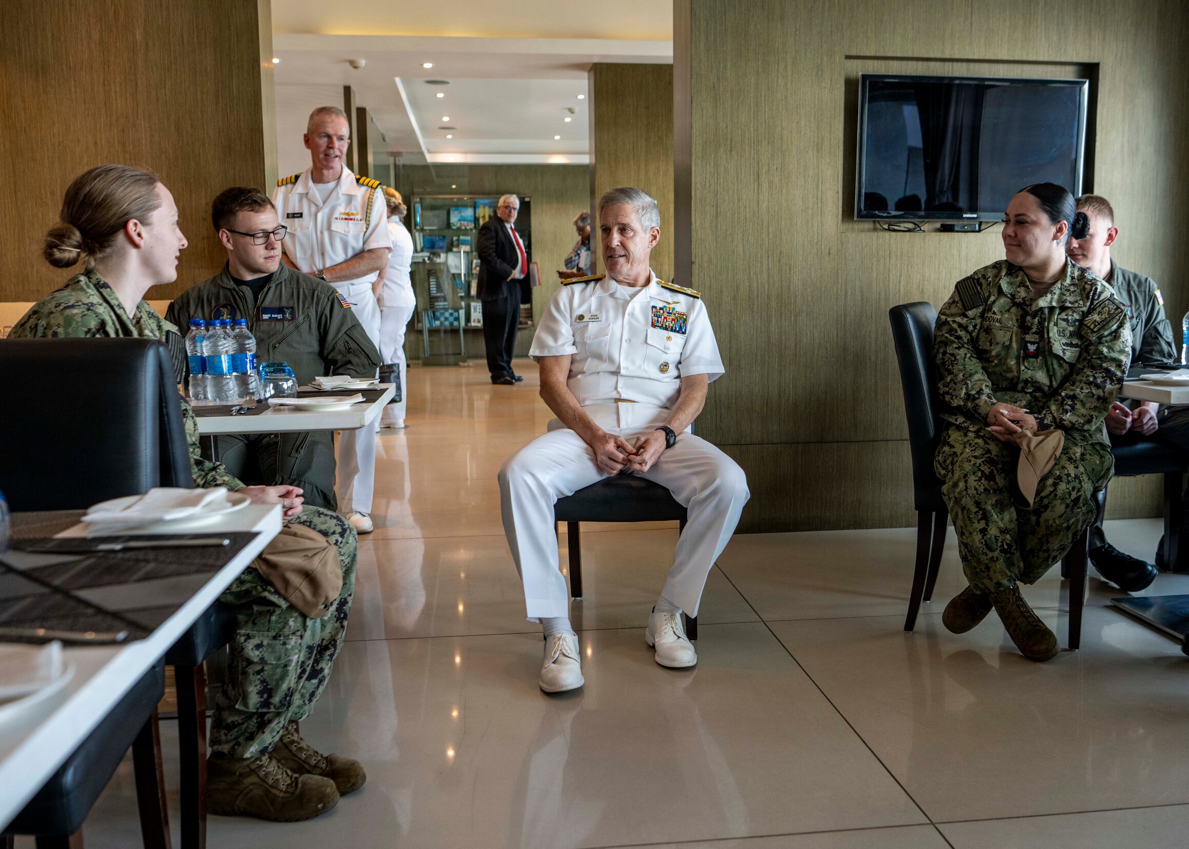 Adm. Steve Koehler, commander, U.S. Pacific Fleet, center, meets with Sailors assigned to Maritime Patrol Squadron (VP) 4 during exercise MILAN 2026 in Visakhapatnam, India, Feb. 18, 2026. Hosted by the Indian Navy, MILAN 2026 is a biennial, multilateral exercise focused on enhancing interaction between professional navies and gaining experience in operations at sea. The visit to India underscored the U.S. commitment to strengthening partnerships for an Indo-Pacific that is secure, free, and prosperous. (U.S. Navy photo by Mass Communication Specialist 2nd Class Jeremy R. Boan)