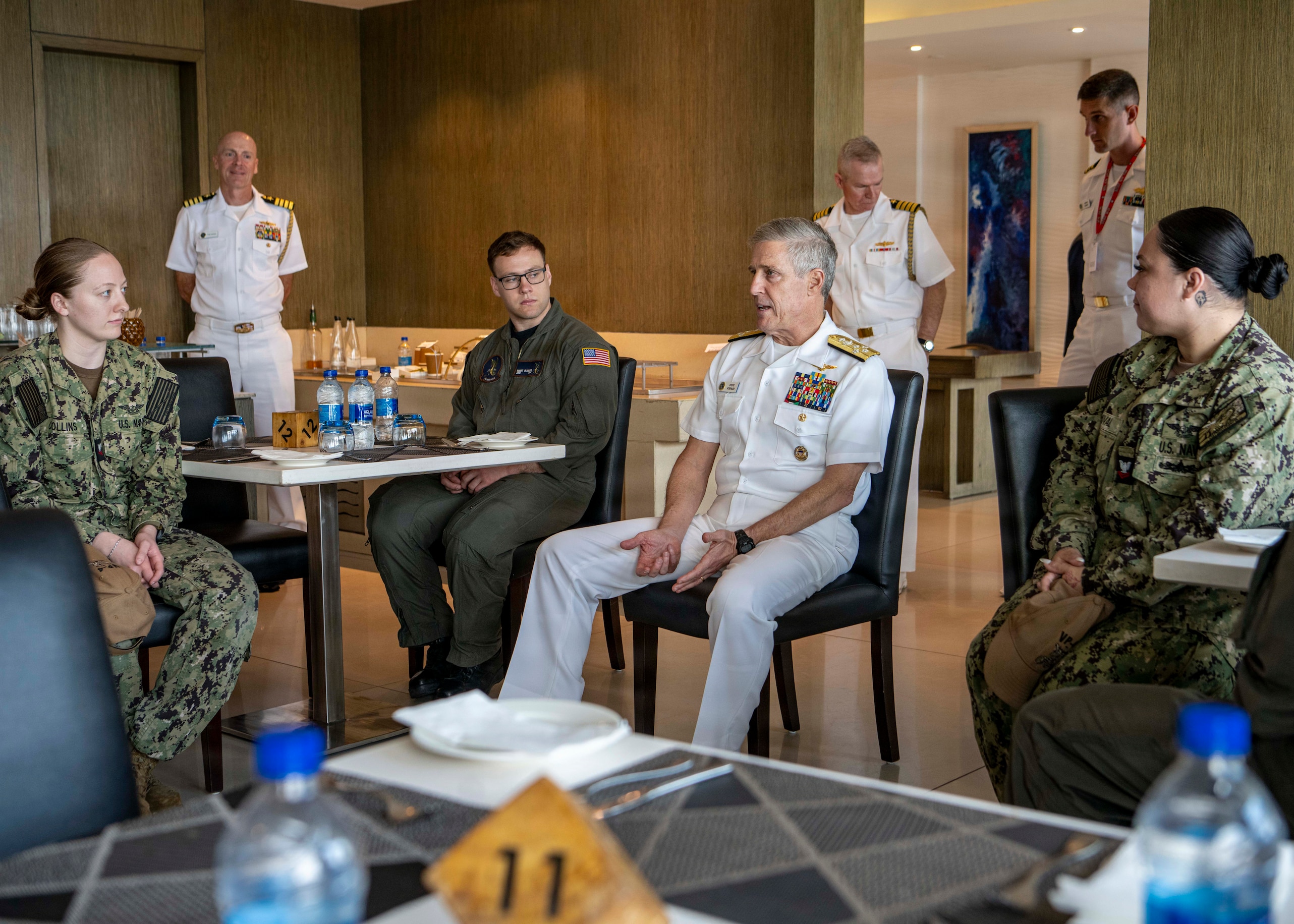 Adm. Steve Koehler, commander, U.S. Pacific Fleet, center, meets with Sailors assigned to Maritime Patrol Squadron (VP) 4 during exercise MILAN 2026 in Visakhapatnam, India, Feb. 18, 2026. Hosted by the Indian Navy, MILAN 2026 is a biennial, multilateral exercise focused on enhancing interaction between professional navies and gaining experience in operations at sea. The visit to India underscored the U.S. commitment to strengthening partnerships for an Indo-Pacific that is secure, free, and prosperous. (U.S. Navy photo by Mass Communication Specialist 2nd Class Jeremy R. Boan)