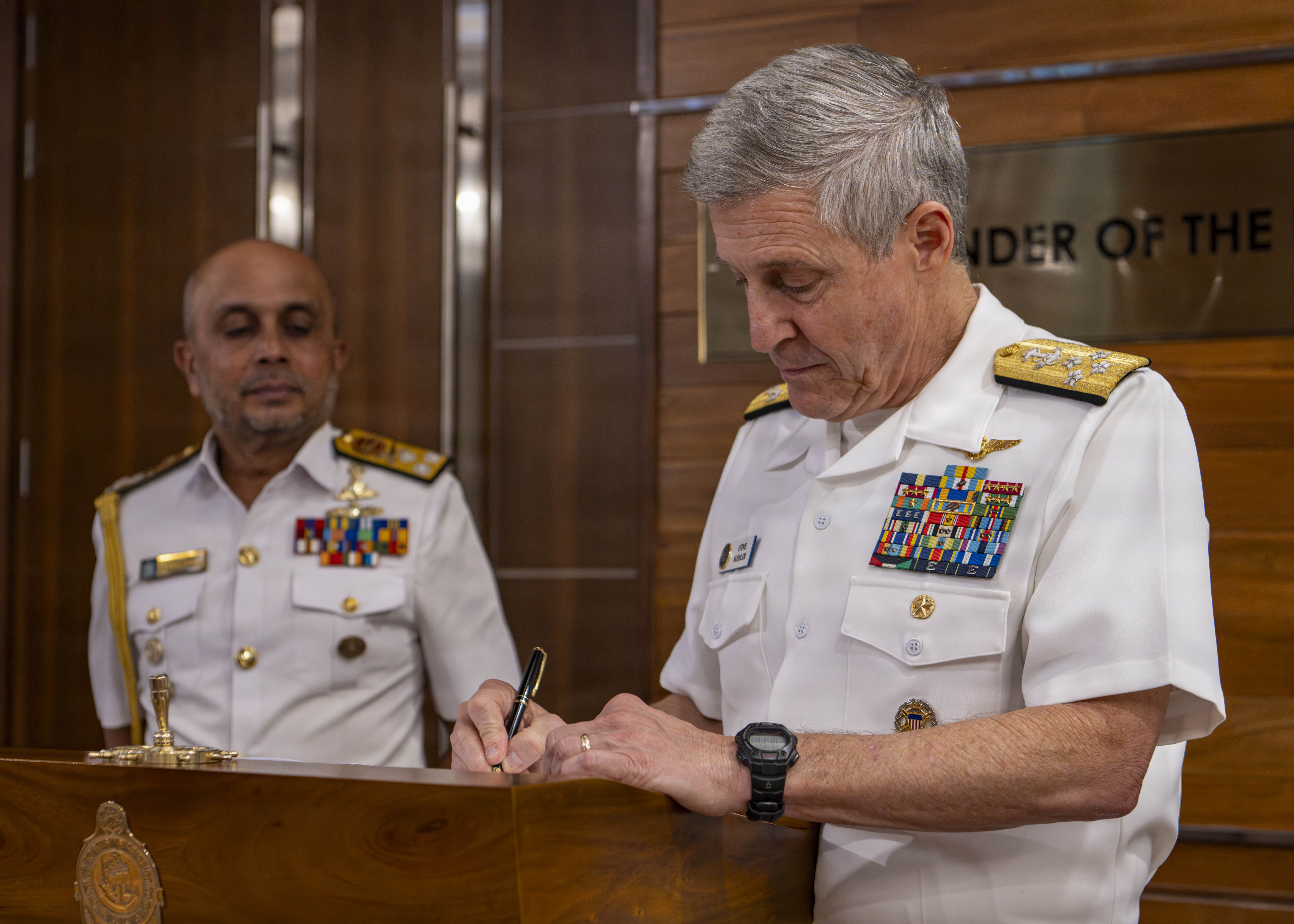 Vice Adm. Kanchana Banagoda, commander of the Sri Lanka Navy, looks on Adm. Steve Koehler, commander, U.S. Pacific Fleet, right, as he signs a guest book at the Sri Lanka Navy Headquarters during his visit to Colombo, Sri Lanka, Feb. 20, 2026. The visit to Sri Lanka reaffirmed the U.S. commitment to building strong partnerships that advance a free, open, and prosperous Indo-Pacific. (U.S. Navy photo by Mass Communication Specialist 2nd Class Jeremy R. Boan)