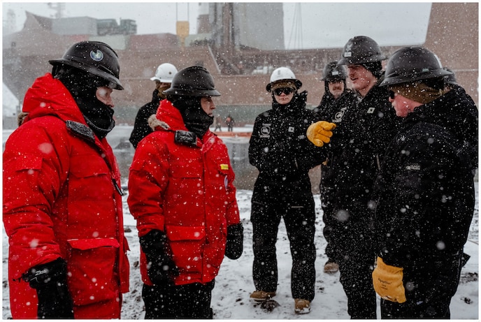 Adm. Steve Koehler, commander, U.S. Pacific Fleet, center left, interacts with Sailors assigned to Naval Mobile Construction Battalion (NMCB) 3 – Antarctica Detachment during a tour of McMurdo Station while in Antarctica, Feb. 12, 2026. Koehler visited Antarctica to meet with service members assigned to Joint Task Force-Support Forces Antarctica, deployed in support of Operation Deep Freeze, which provides logistic support for the U.S. Antarctic Program. The U.S. is committed to a free and open Indo-Pacific region, and trains the military to support the U.S. National Science Foundation programs located in one of the most challenging and austere environments on the planet. (U.S. Navy photo by Builder 2nd Class Komlan Adjassem)