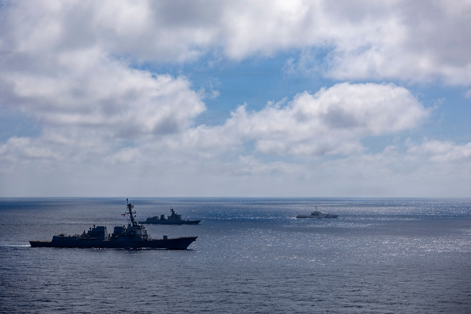 From left to right, U.S. Navy Arleigh Burke-class guided-missile destroyer USS Dewey (DDG 105), Philippine Navy Jose Rizal-class guided-missile frigate BRP Antonio Luna (FFG 151) and Philippine Coast Guard Gabriela Silang-class offshore patrol vessel BRP Gabriela Silang (OPV 8301) steam in formation in the Philippine Sea, during the multilateral Maritime Cooperative Activity (MCA) alongside Japan and the Philippines in the Philippines’ Exclusive Economic Zone, Feb. 25, 2026. The U.S. Navy routinely operates with the Armed Forces of the Philippines and partners and allies through MCAs to continually develop, exercise and enhance multi-domain tactical interoperability to uphold peace and security in the region. Dewey is forward-deployed and assigned to Destroyer Squadron (DESRON) 15, the Navy’s largest DESRON and the U.S. 7th Fleet’s principal surface force. (U.S. Navy photo by Mass Communication Specialist 2nd Class Oscar Diaz)