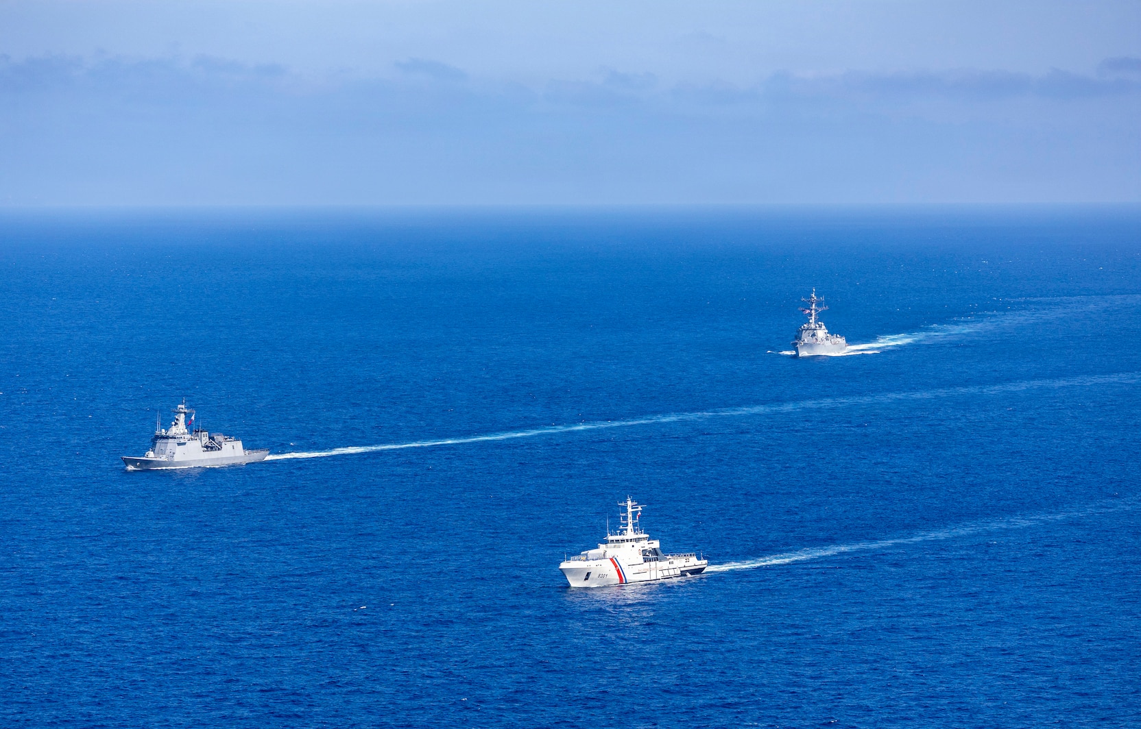 From left to right, Philippine Navy Jose Rizal-class guided-missile frigate BRP Antonio Luna (FFG 151), Philippine Coast Guard Gabriela Silang-class offshore patrol vessel BRP Gabriela Silang (OPV 8301), and U.S. Navy Arleigh Burke-class guided-missile destroyer USS Dewey (DDG 105) steam in formation in the Philippine Sea, during the multilateral Maritime Cooperative Activity (MCA) alongside Japan and the Philippines in the Philippines’ Exclusive Economic Zone, Feb. 25, 2026. The U.S. Navy routinely operates with the Armed Forces of the Philippines and partners and allies through MCAs to continually develop, exercise and enhance multi-domain tactical interoperability to uphold peace and security in the region. Dewey is forward-deployed and assigned to Destroyer Squadron (DESRON) 15, the Navy’s largest DESRON and the U.S. 7th Fleet’s principal surface force. (U.S. Navy photo by Mass Communication Specialist 2nd Class Oscar Diaz)